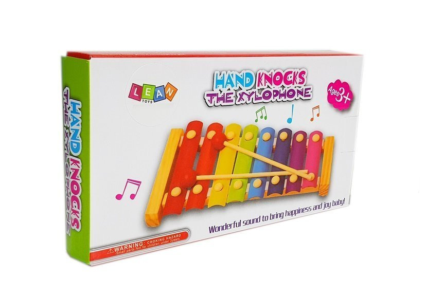 Cymbałki na solidnym spodzie wykonanym z naturalnego drewna. W zestawie dwie pałeczki z czerwoną kuleczką na końcu.