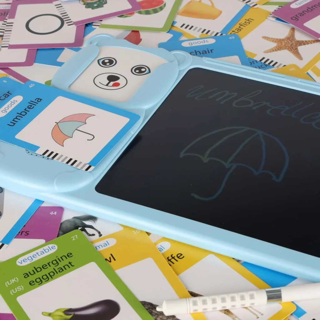 W zestawie znajdziesz również tablet z rysikiem w formie znikopisu, który pozwala dziecku rysować i pisać, utrwalając nowe słowa w formie zabawy. To doskonały sposób na rozwijanie wyobraźni i zdolności manualnych.