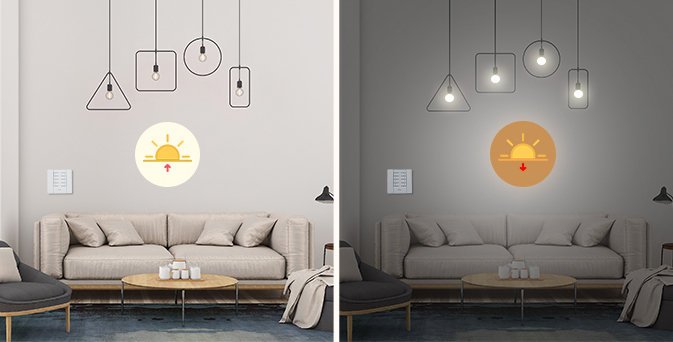 Wbudowana funkcja automatycznego włączania i wyłączania światła w zależności od wschodu i zachodu słońca sprawia, że korzystanie z ściemniacza jest jeszcze bardziej wygodne. Możesz również ustawić scenariusze, by światło stopniowo rozjaśniało się, gdy robi się ciemno.