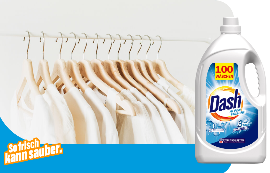 Innowacyjna technologia Dash chroni włókna przed szarzeniem, utrzymując śnieżnobiałą biel na dłużej. Alpejska świeżość zapewnia przyjemny, długotrwały zapach, który otula tkaniny delikatnym, czystym aromatem.