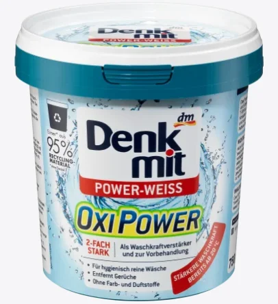 Denkmit Oxi Power Weiss to skuteczny odplamiacz przeznaczony do białych tkanin, takich jak koszule, T-shirty, bielizna czy obrusy. Dzięki połączeniu zaawansowanych kryształów Oxi oraz silnych środków wybielających, przywraca blask szarym materiałom. Dodatkowo, zawarta w produkcie aktywna formuła dezodorantu eliminuje nieprzyjemne zapachy, zapewniając głęboką i higieniczną czystość.