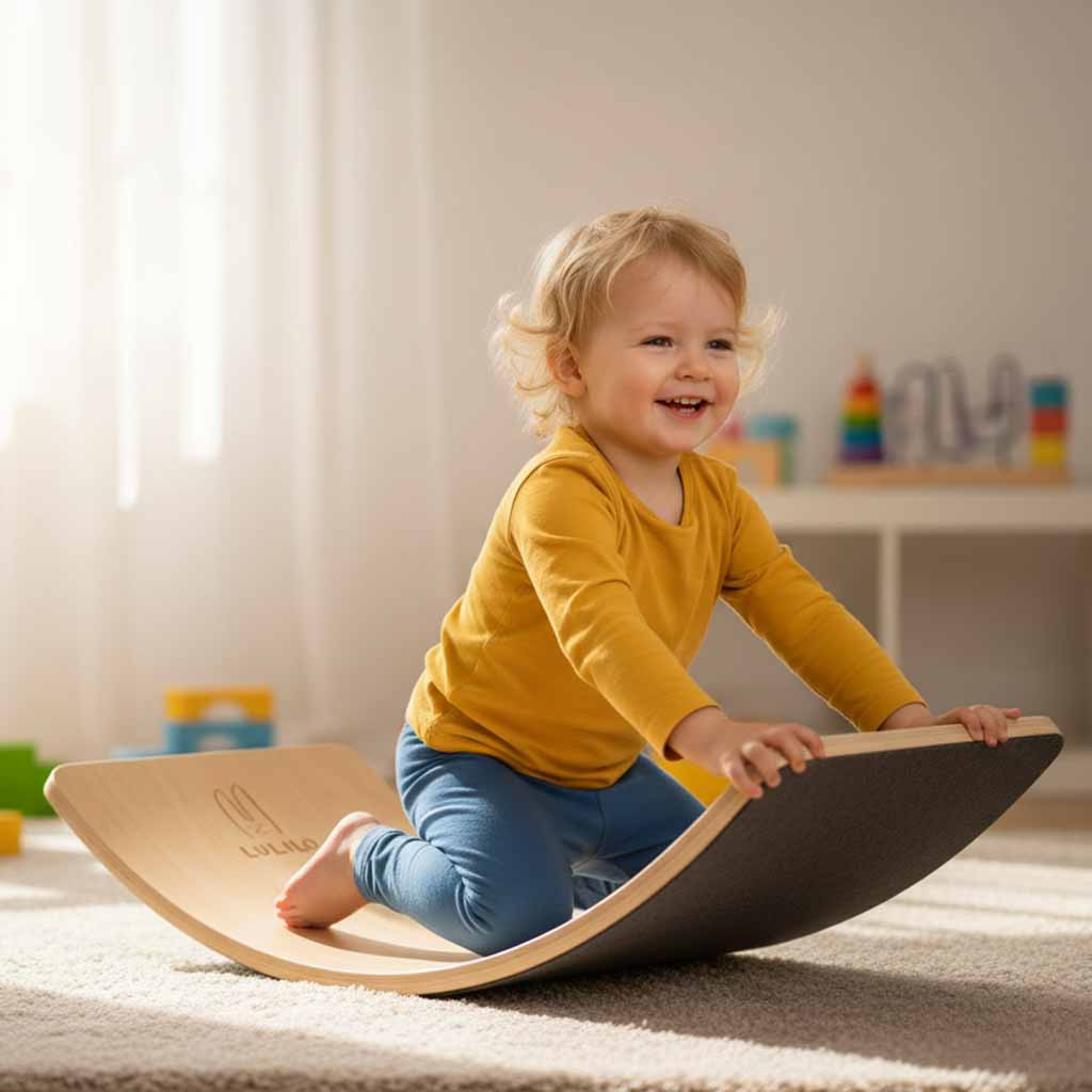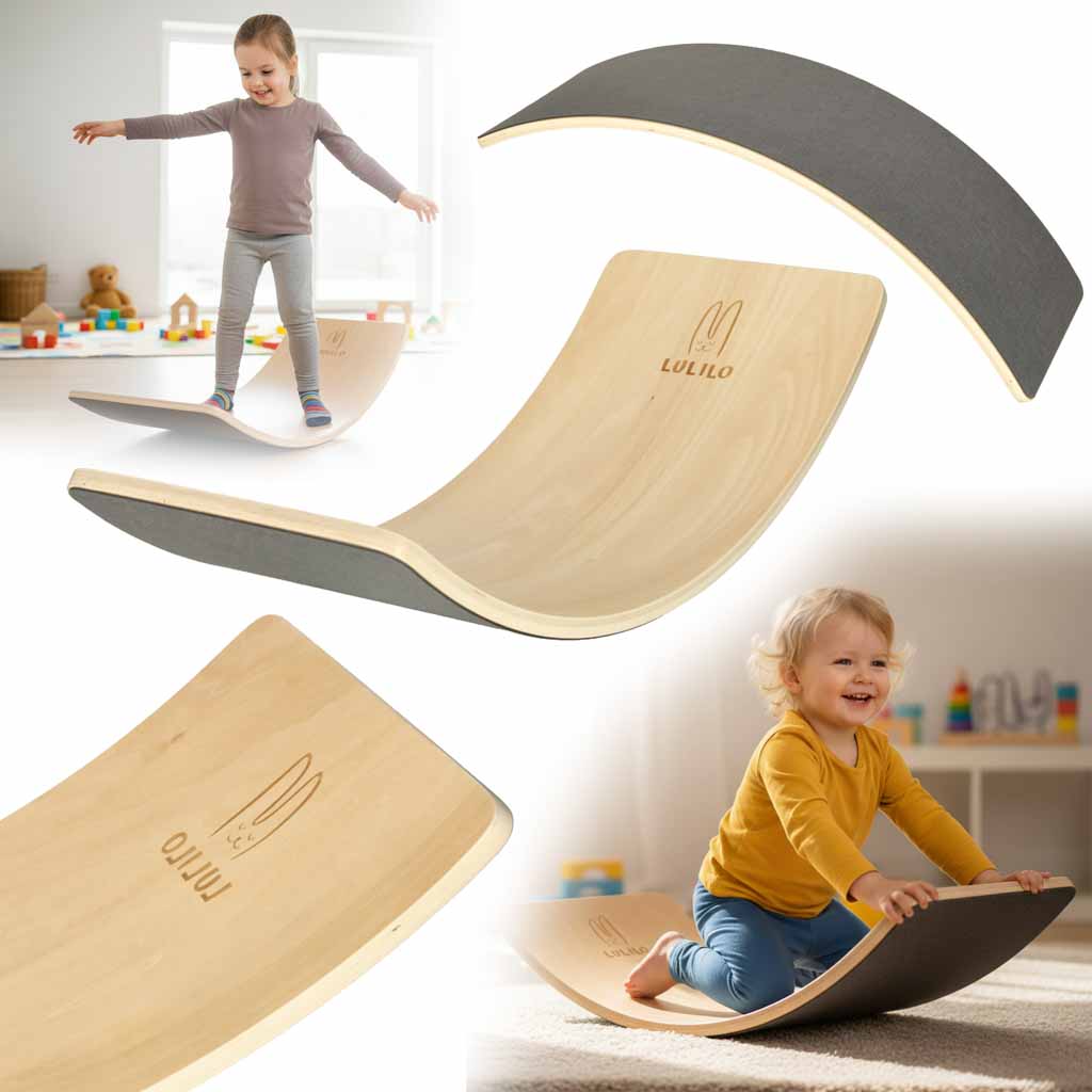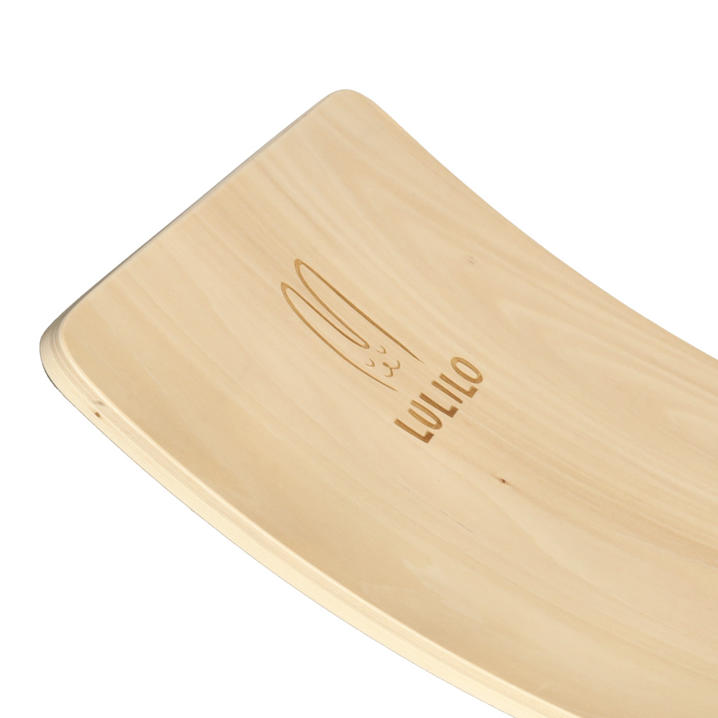 Deska do balansowania wspiera rozwój koordynacji ruchowej u dzieci oraz angażuje dorosłych do regularnej aktywności. Może służyć jako stołek, bujak lub element toru wyścigowego dla zabawek. Pokrycie dolnej części trwałym filcem chroni podłogę przed zarysowaniami oraz zwiększa komfort użytkowania.
