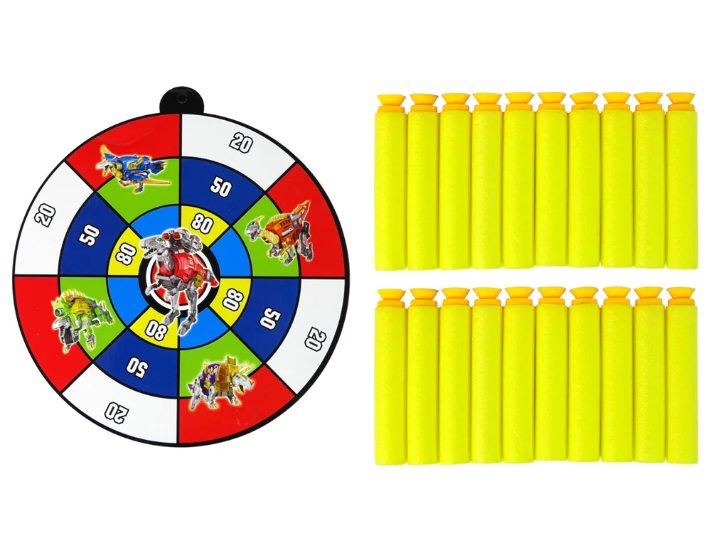 Pistolet na strzałki posiada intensywny niebieski kolor i duży zasięg strzału. Z pistoletu można przekształcić go w wielkiego Pterosaura, fan dinozaurów może zamienić się w komandosa i zacząć zabawę od początku. Tarcza dołączona do zestawu pozwala na ćwiczenie celności i zbieranie punktów. Rozpocznij rywalizację z rówieśnikami i sprawdź, kto ma lepszy cel!