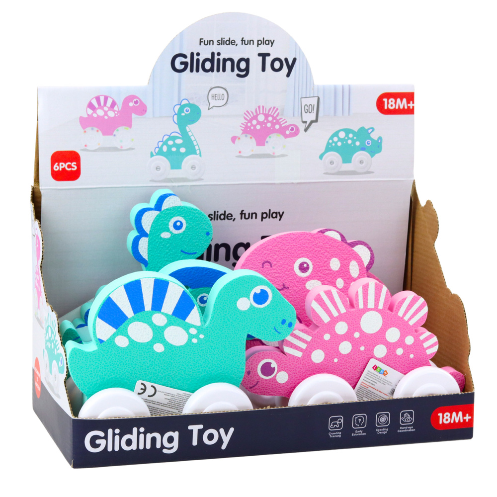 Dzięki kółkom zabawki swobodnie się toczą, a lekka konstrukcja sprawia, że dziecko z łatwością może je popychać i zabierać ze sobą wszędzie. Zabawka rozwija motorykę, koordynację ręka-oko oraz kreatywność podczas wymyślania przygód z udziałem wesołych dinozaurów. Piankowy materiał jest miękki i bezpieczny, a jego struktura odporna na odkształcenia i łatwa do utrzymania w czystości.
