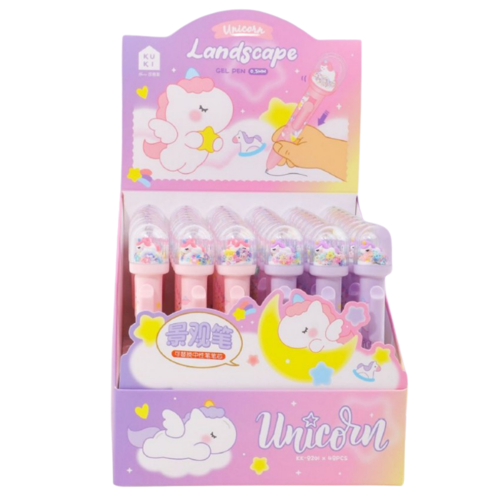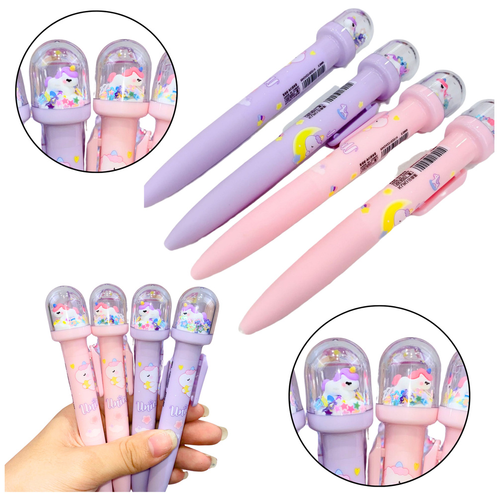 Uroczy długopis z figurką i ruchomym brokatem to idealny dodatek do szkolnego zestawu dla dzieci i młodzieży. Pastelowe kolory, bajkowe motywy oraz przezroczysta kopułka z ruchomymi elementami sprawiają, że pisanie staje się jeszcze przyjemniejsze. Długopis wyróżnia się unikalnym designem – w przezroczystej nasadce umieszczona jest figurka w otoczeniu pływających gwiazdek, brokatu i innych dekoracyjnych drobinek.