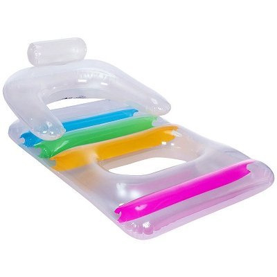 Bardzo wygodny i praktyczny materac przyda się wszystkim miłośnikom zarówno wody jak i spędzania czasu na plaży. Materac może służyć zarówno jako klasyczny materac również do opalania jak i fotel do pływania. Dodatkowym atutem, który zapewni Ci wygodę i relaks są podłokietniki i dmuchane oparcie. Klasyczne białe elementy w połączeniu z tęczowymi elementami z pewnością przypadną Ci do gustu.