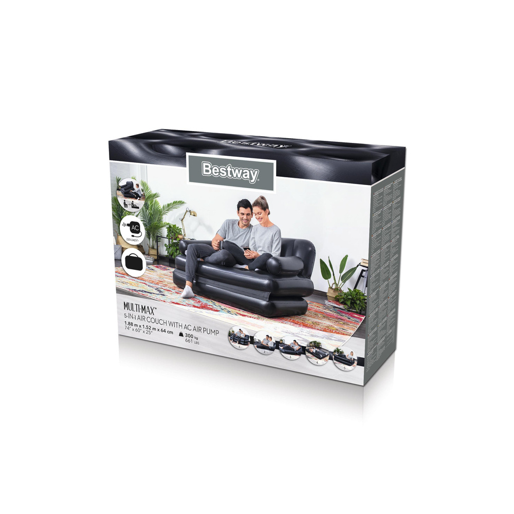 Już teraz możesz w parę sekund zamienić wysoką sofę na dwuosobowe łóżko, łóżko z oparciem lub po prostu bardzo wygodny materac. Decyzja należy tylko do Ciebie. Sofa wykonana została z mocnego PVC. Wygodne podłokietniki sprawiają, że oglądanie ulubionego serialu bądź czytanie ulubionej książki staje się czysta przyjemnością. Materac przeznaczony jest do użytku dwuosobowego. Dołączona do zestawu elektryczna pompka przyśpieszy proces montażu kanapy. Dzięki specjalnej budowie kanapę można szybko i bez wysiłku przekształcić a dzięki solidnej konstrukcji z winylu, sofa jest odporna na uszkodzenia i wygodna. Łóżko jest odpowiednie do użytku w pomieszczeniach. W zestawie znajduje się specjalny futerał, który ułatwia transport i zapewnia bezpieczne przechowywanie.