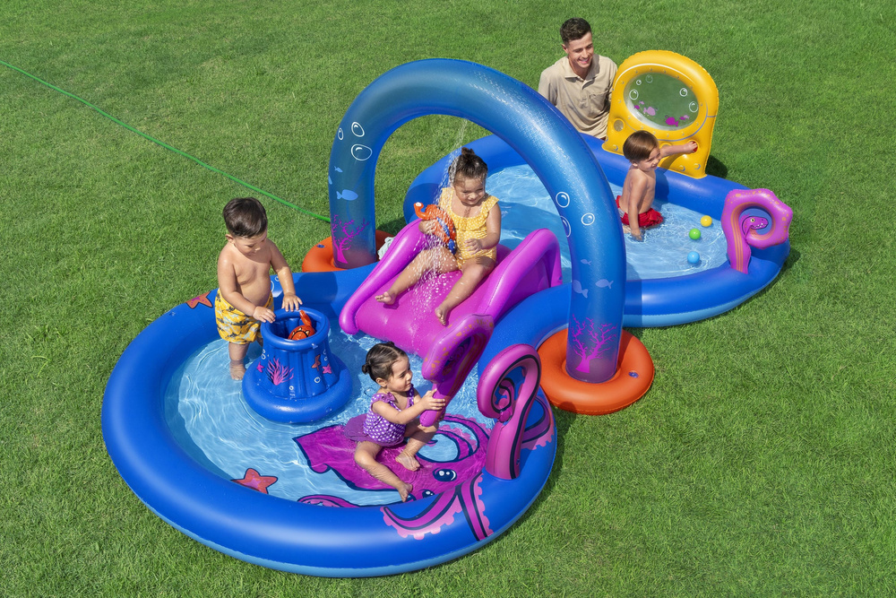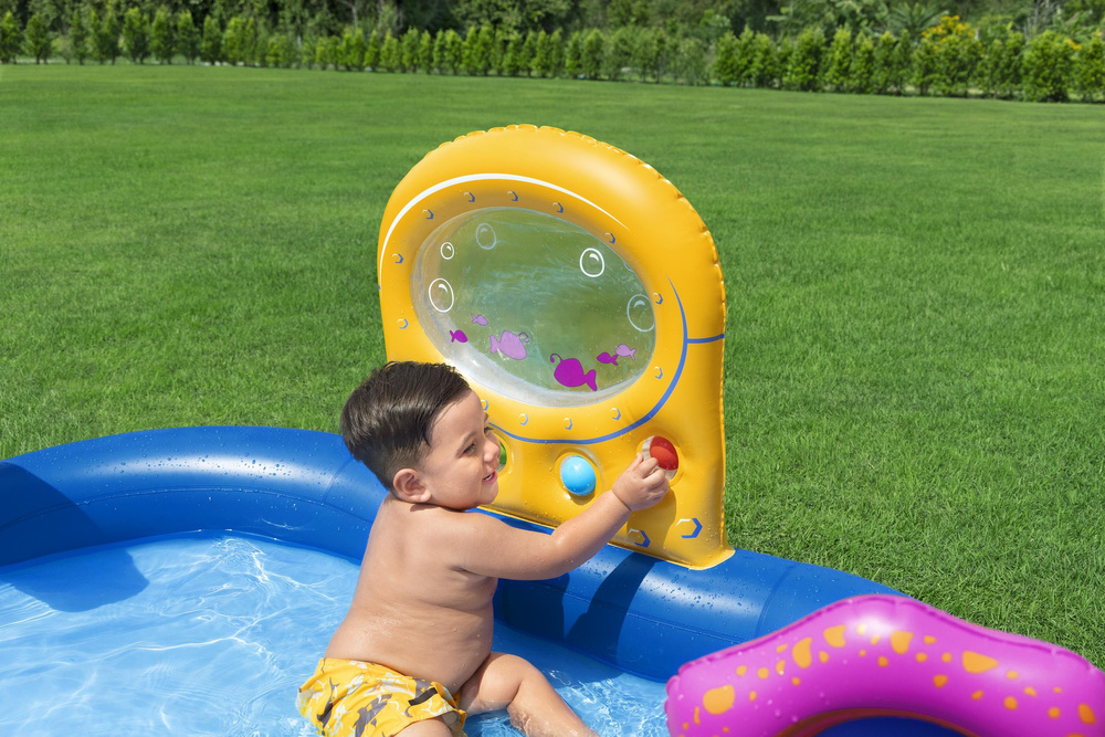 Centrum zabaw wykonane jest z wytrzymałego PVC, co gwarantuje odporność na intensywną zabawę. Zintegrowany zraszacz wodny w formie zdejmowanego łuku zapewnia orzeźwiające chłodzenie w upalne dni. Odłączana zjeżdżalnia wodna gwarantuje szybkie i ekscytujące zjazdy, a dodatkowe atrakcje, jak gra w sortowanie na ścianie łodzi podwodnej oraz wiele interaktywnych akcesoriów, zapewniają mnóstwo rozrywki!