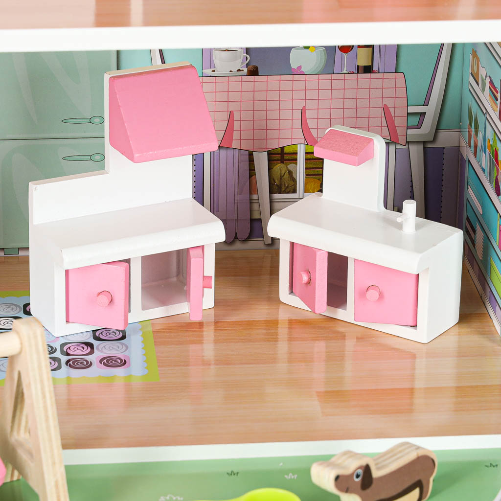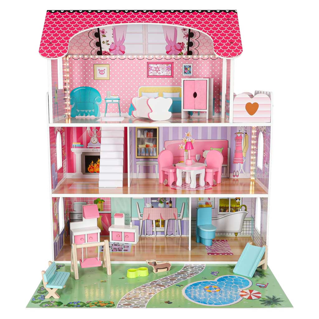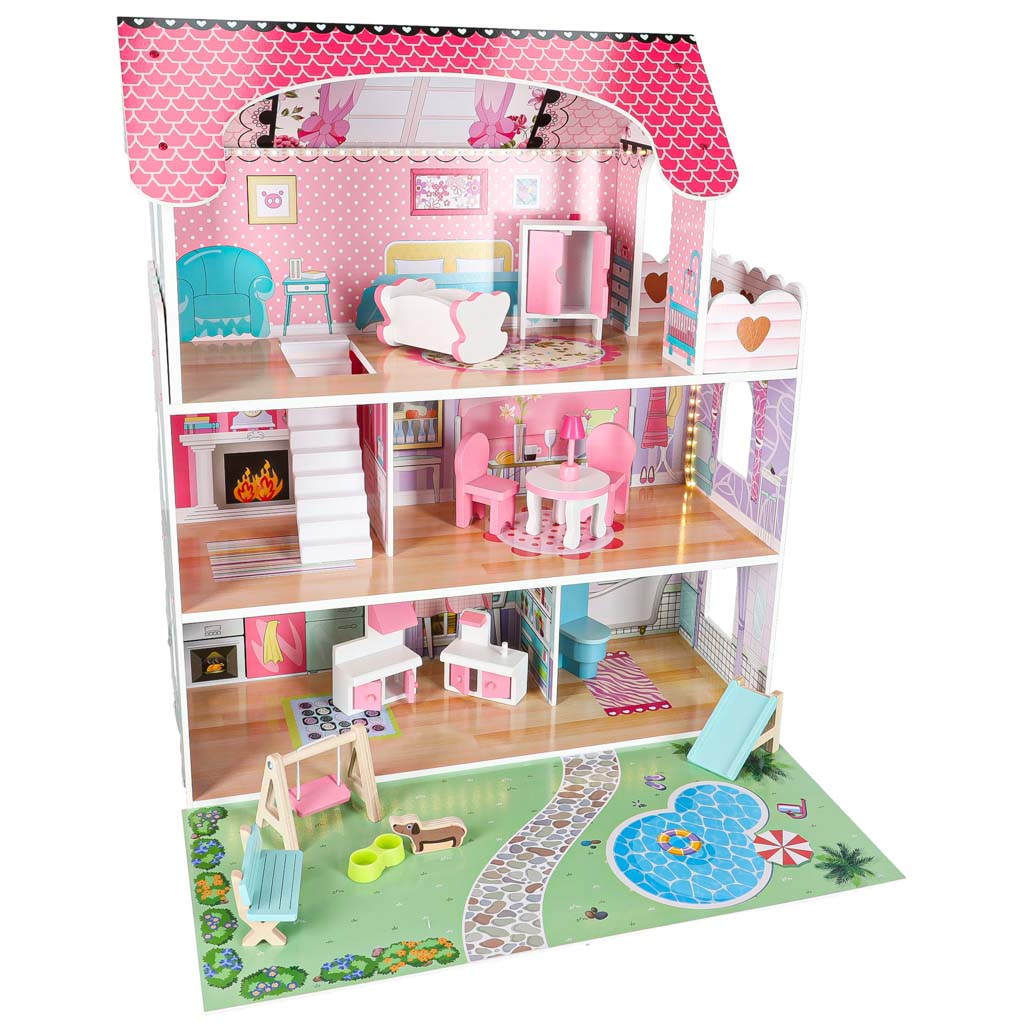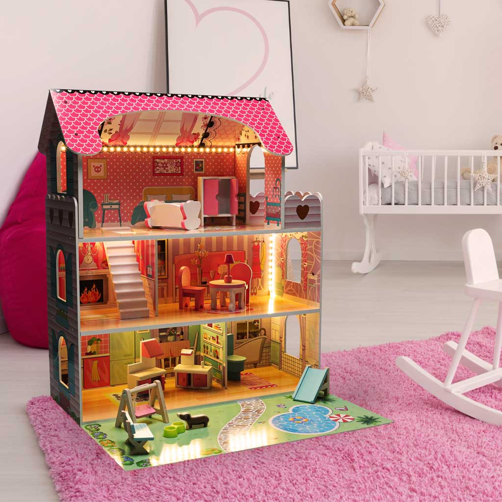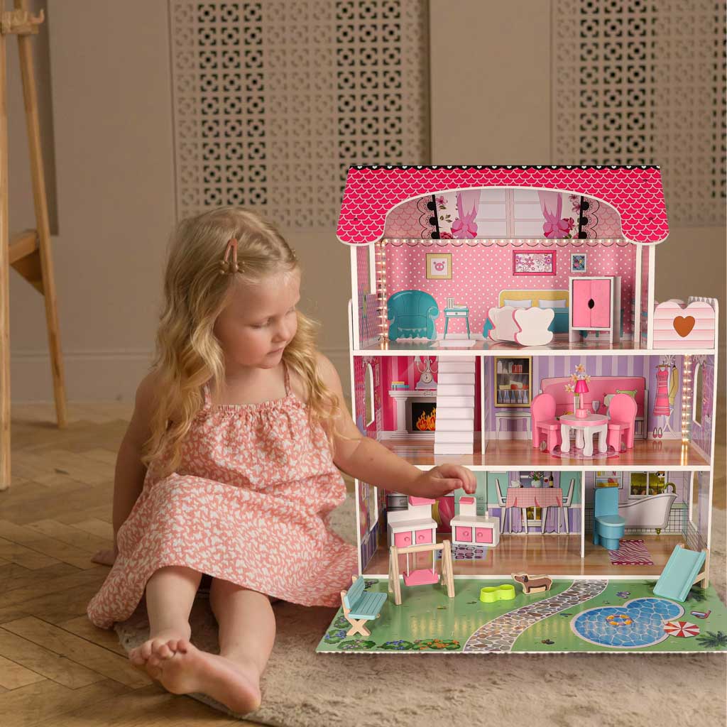 Oferujemy wyjątkowy domek dla lalek, który zachwyci każde dziecko. Dzięki różowym kolorom i funkcjonalnym elementom, zabawa staje się jeszcze przyjemniejsza. W zestawie znajdują się nie tylko mebelki, ale także piesek i taras, co sprawia, że domek staje się idealnym miejscem do kreatywnej zabawy.