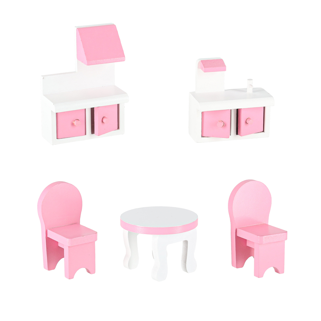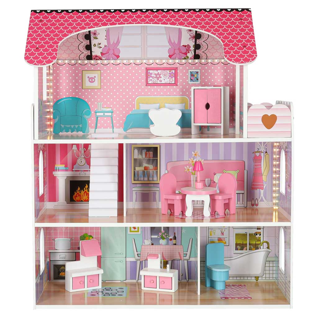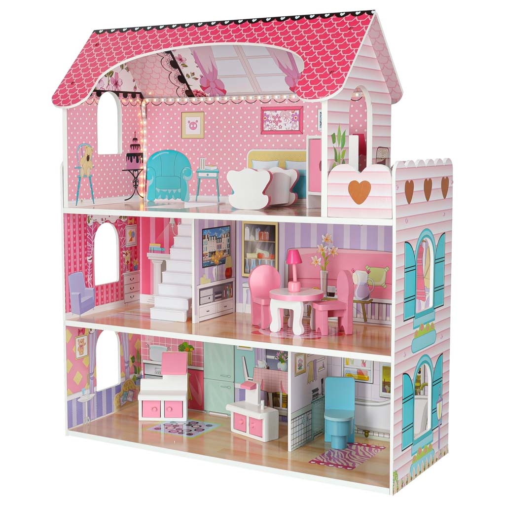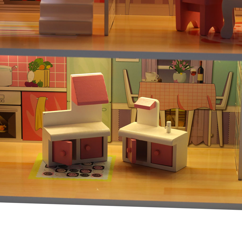 Oświetlenie LED (zimny biały) dodaje uroku i może pełnić funkcję lampki nocnej. Mebelki wykonane są z drewna, co zapewnia estetyczny wygląd i trwałość. Domek został starannie wyszlifowany, aby zapewnić bezpieczeństwo podczas zabawy.