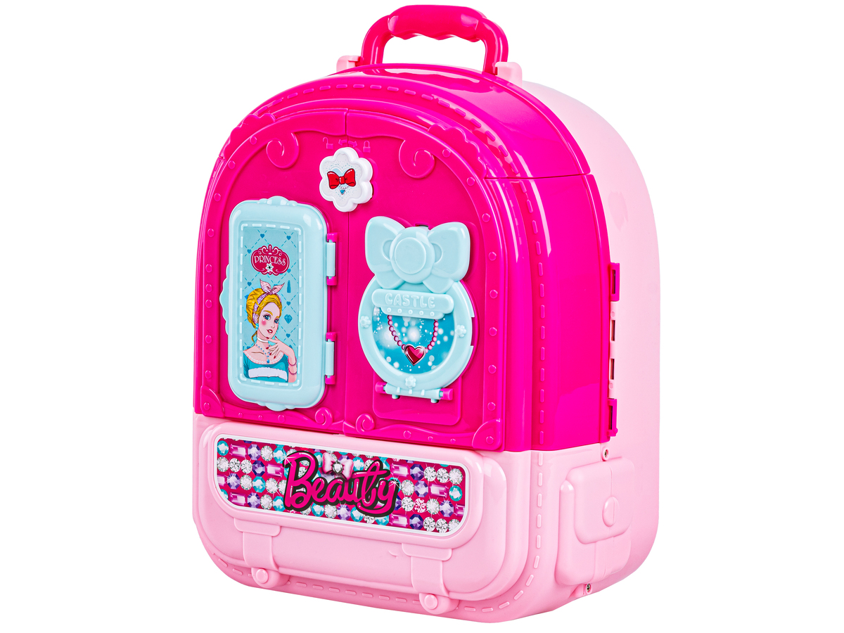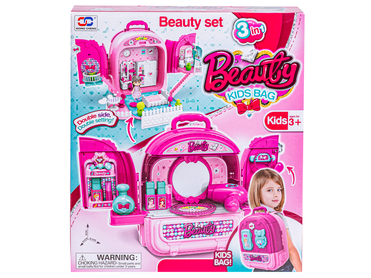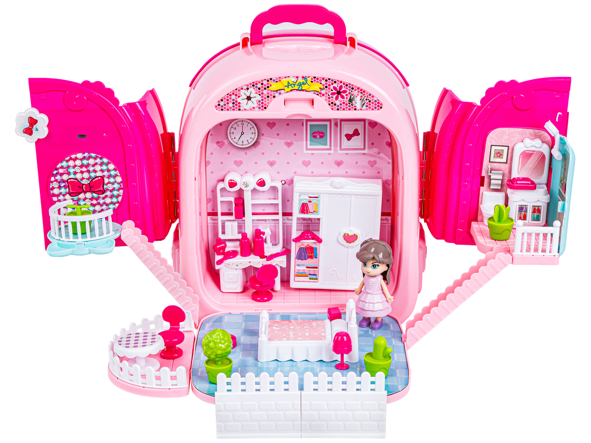 Plecak inny niż wszystkiePlecak otwierany jest z dwóch stron. Każda z nich kryje w sobie inne możliwości zabawy. Jedna to mini toaletka z lusterkiem, kosmetykami, biżuterią oraz suszarką do włosów. Druga strona to uroczy domek dla lalek z sypialnią, tarasem oraz wyposażoną łazienką. | ![]() |