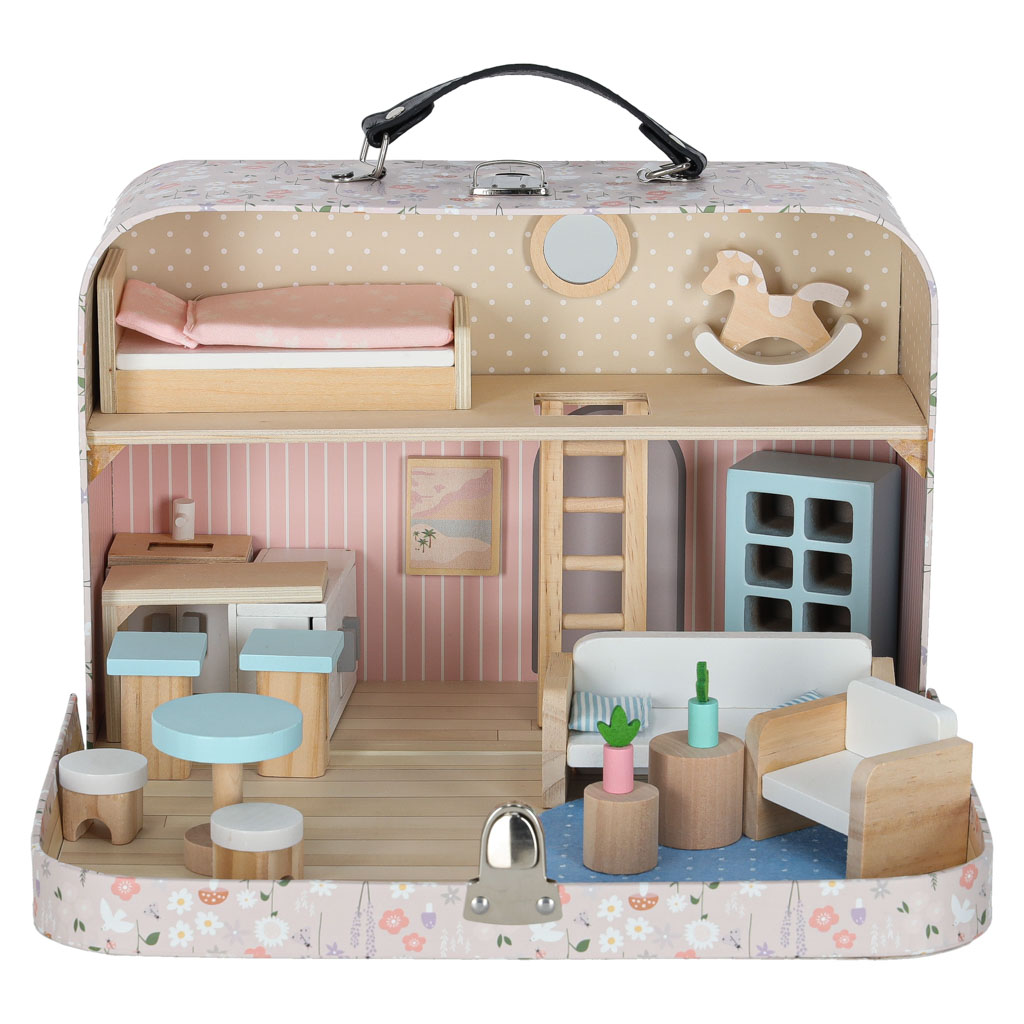 Miniaturowy domek dla lalek w formie walizki skrywa urocze mebelki z materiału i drewna. Delikatne pastelowe kolory połączone z naturalnym drewnem nadają wnętrzom atmosferę przytulności. W domku można umieścić małe lalki oraz figurki – wczuwanie się w perypetie zabawek rozwija empatię oraz inteligencję emocjonalną.