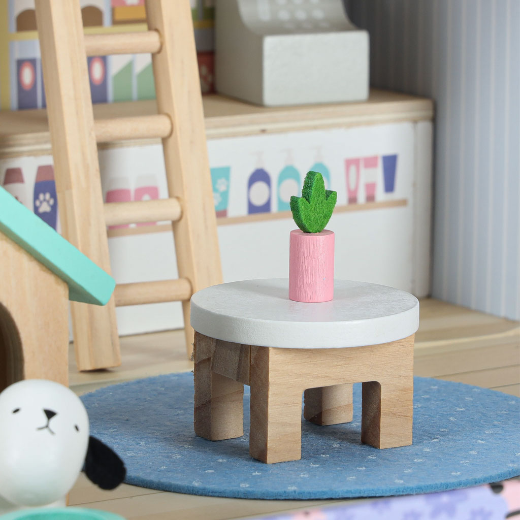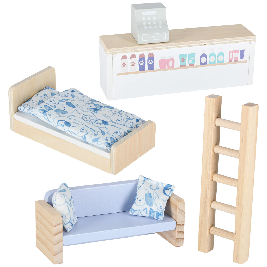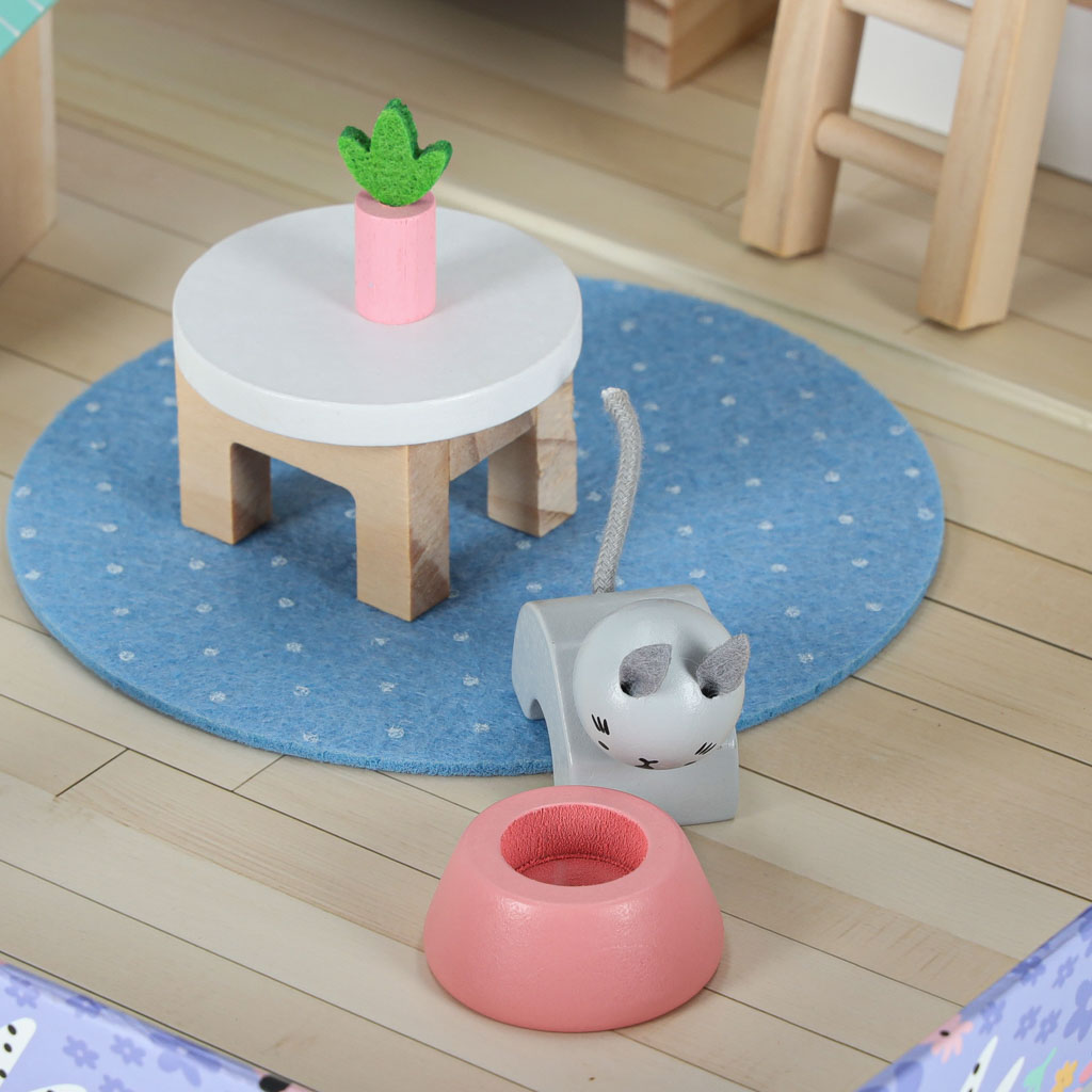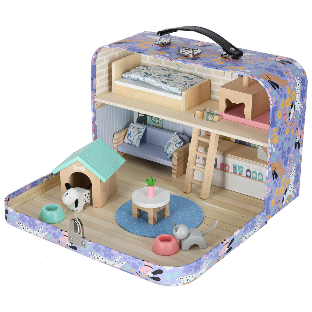 W domku mieszka pies i kot – mają swoje miski, a także legowiska w postaci budy i drapaka. Różnorodne akcesoria w zestawie dają wiele pomysłów na kreatywne zabawy. Po użyciu można schować mebelki z powrotem do walizki, co ułatwia utrzymanie porządku.