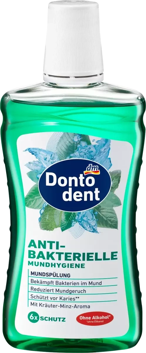 Dontodent Antibakterielle to płyn do płukania jamy ustnej o pojemności 500 ml, który skutecznie dba o higienę jamy ustnej. Jego bezalkoholowa formuła* dociera do trudno dostępnych miejsc, gdzie szczoteczka nie sięga. Dzięki innowacyjnej technologii 6-krotnej ochrony, płyn zwalcza bakterie odpowiedzialne za płytkę nazębną oraz nieświeży oddech, a także wspiera zdrowie dziąseł i chroni przed próchnicą**. Kompozycja czterech ziół: rumianku, szałwii, mięty i mirry pomaga wzmocnić szkliwo zębów oraz pielęgnować błonę śluzową jamy ustnej. Ziołowy aromat mięty zapewnia długotrwałą świeżość oddechu.