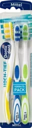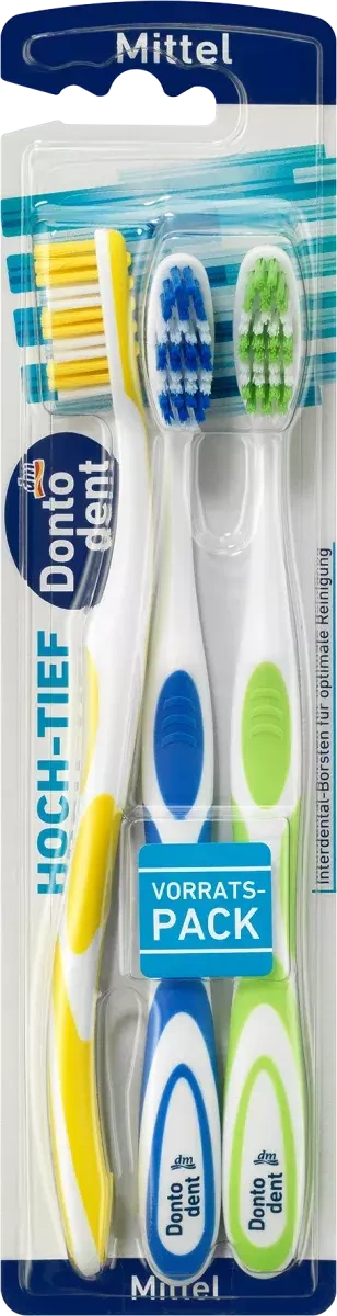 Średnia szczoteczka do zębów Dontodent Hoch-Tief w zestawie 3 szt. zapewnia skuteczne czyszczenie zębów dzięki innowacyjnemu cięciu włosia. Dłuższe włosie dociera do trudno dostępnych miejsc międzyzębowych, a krótsze skutecznie oczyszcza powierzchnię zębów. To idealne rozwiązanie dla osób dbających o higienę jamy ustnej.