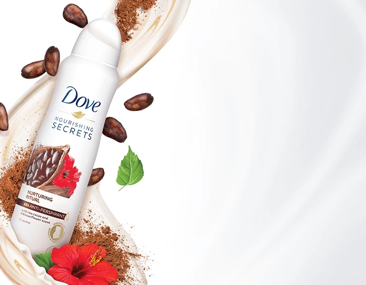 Dove Nourishing Secrets Nurturing Ritual to antyperspirant spray, który zapewnia skuteczną ochronę przed potem, a jednocześnie rozpieszcza zmysły wyjątkowym zapachem. Produkt inspirowany rytuałami piękna z Ghany, w których wykorzystuje się ziarna kakaowca oraz kwiaty hibiskusa, łączy w sobie naturalne składniki znane z odżywczych właściwości i urzekającego aromatu.