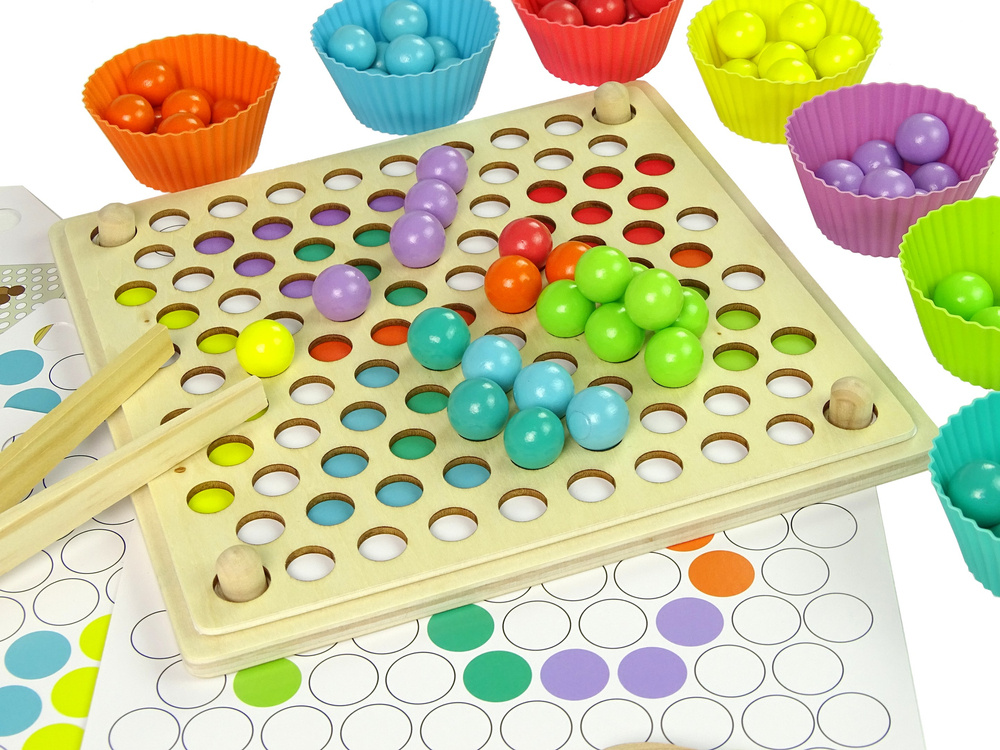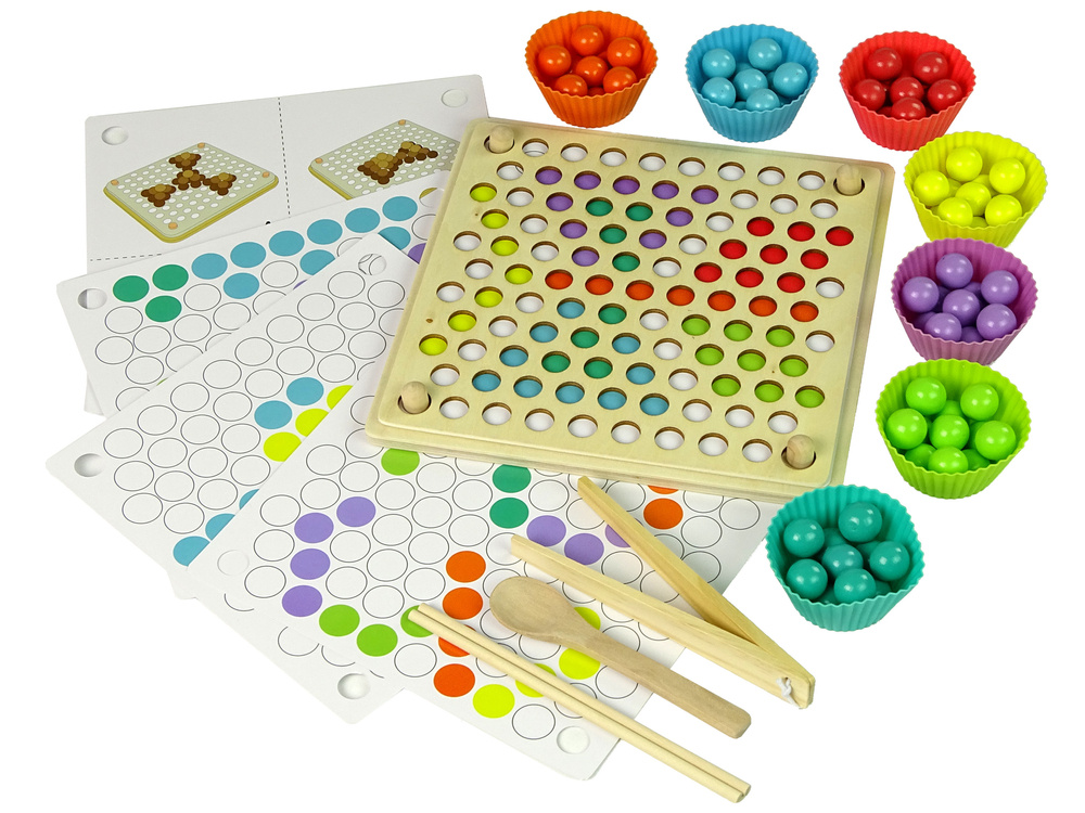Zabawa polega na układaniu obrazków za pomocą wielu kuleczek o różnych kolorach. Pojemniczki w kształcie foremek pozwalają na posortowanie kuleczek. W zestawie znajdują się także obrazki, które można stworzyć ze znajdujących się w zestawie elementów. Jak układać kuleczki? Tu mamy utrudnienie, do dyspozycji mamy pałeczki, szczypce bądź łyżkę.