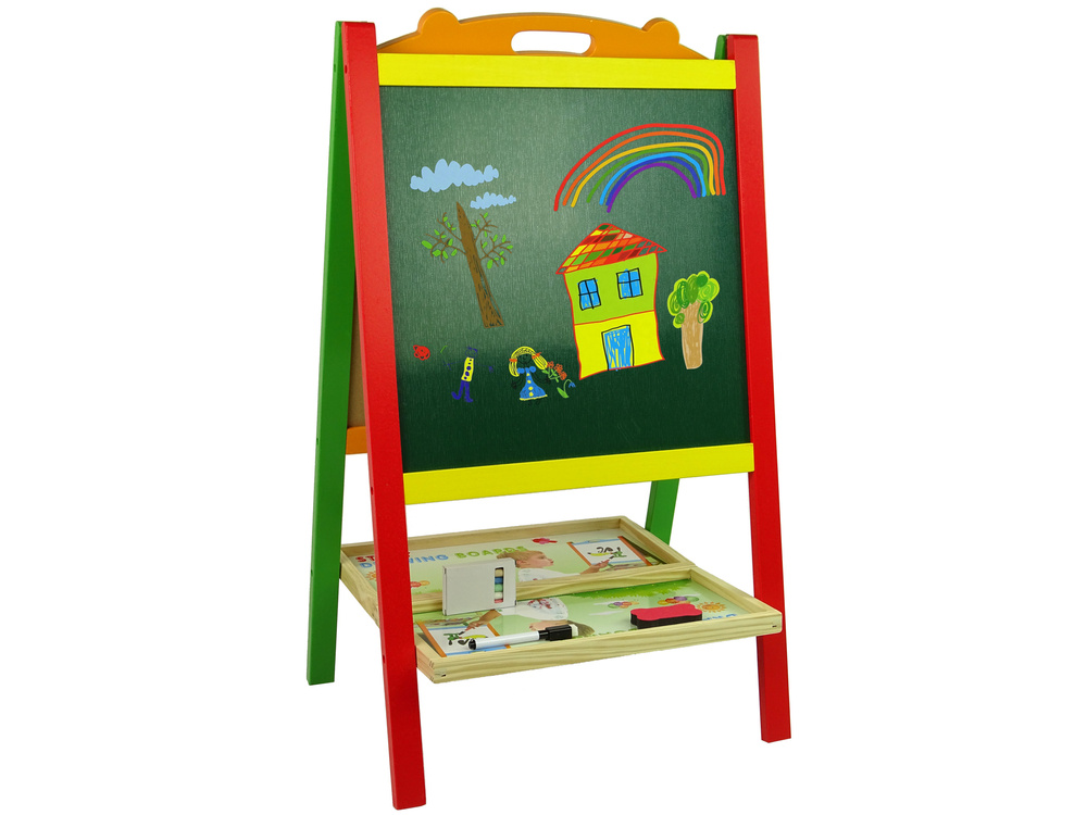 Drewniana konstrukcja jest w pełni bezpieczna dla dzieci, stabilna i pozbawiona niebezpiecznych elementów. Tablica jest na składanym stelażu, dzięki czemu złożona zajmuje niewiele miejsca.