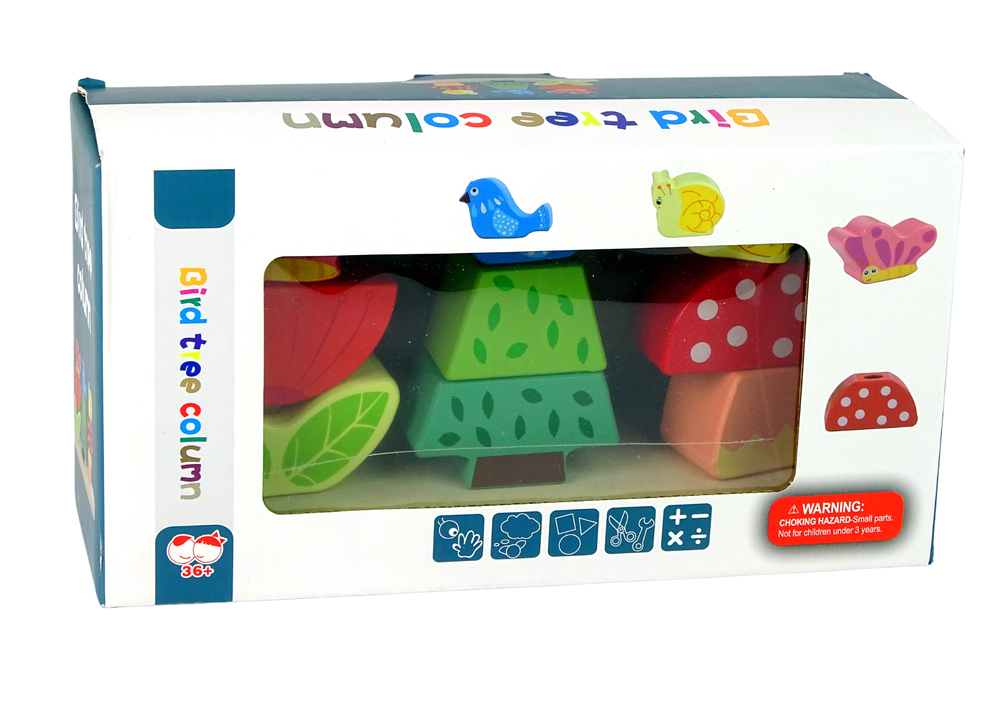 Zestaw składa się z drewnianej podstawki z trzema wystającymi pałąkami. Na każdym z nich można w dowolnej kolejności ułożyć klocki, najlepiej, aby wszystko pasowało do siebie. Klocki przedstawiają rośliny i motyle, ułóż je tak, aby zwierzętom pasowało ich naturalne środowisko. Motylka najczęściej spotykamy na kwiatku, a ptaszka na drzewie. Maluch nabędzie niezbędnej wiedzy oraz poćwiczy zdolności manualne i precyzje, wkładając na pałąki różnego kształtu małe drewniane klocki.
