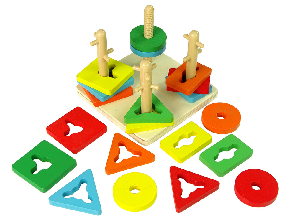 Zestaw składa się z kwadratowej podstawki z wieżami w różnym kształcie oraz z 20 różnokolorowych klocków. Zabawa polega na ułożeniu wieży z odpowiednio pasujących klocków. Największym wyzwaniem jest dobranie odpowiedniego kształtu. Maluch ćwiczy przez to wyobrażenie przestrzenne, precyzję oraz zdolności manualne.
