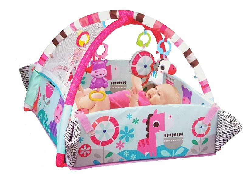Kolorowe grafiki wzbudzają ciekawość dziecka oraz pomagają rozwijać wzrok. Do produktu dołączone są kulki, które możemy wsypać do basenu i zapewnić niezapomnianą zabawę. Matę można używać już od narodzin dziecka. Żywe kolory i wzory przyciągną uwagę najbardziej niespokojnego niemowlaka. Do zestawu załączony jest jeszcze hipopotam na baterie, wystarczy że Twój maluch pociągnie za rączkę i usłyszy muzyczkę. Na górze pomiędzy pałąkami jest także siatka z otworami do rzucania piłeczkami.