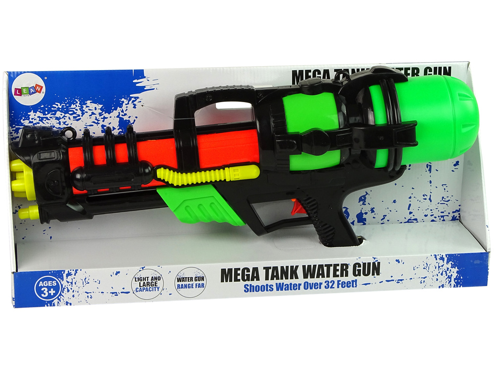 Zbiorniczek pistoletu wystarczy odkręcić i napełnić zbiorniczek do 80 % wodą. Pojemność całego zbiorniczka to 1080 ml. Pojemność sprawi, że zabawa będzie długa i maluch nie musi się martwić o brak amunicji w trakcie boju. Zasięg pistoletu to około 10 m!