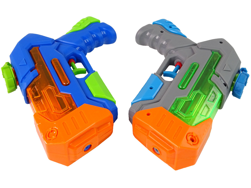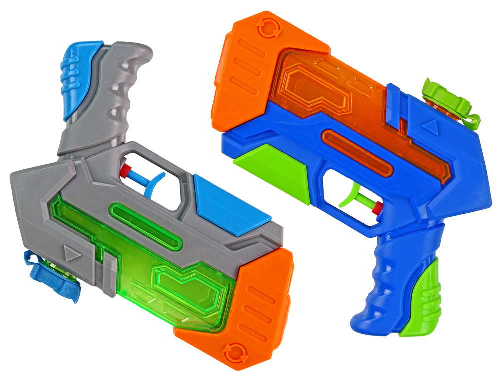 Dwa pistolety są całkowicie bezpieczne dla maluchów, nie mają ostrych zakończeń. Naciskając spust, z lufy wylatuje strumień wody. Zbiornik pomieści około 200 ml wody. Zestaw do zabawy w dwójkę! Różne kolory pozwolą rozróżnić, który pistolet należy do kogo.