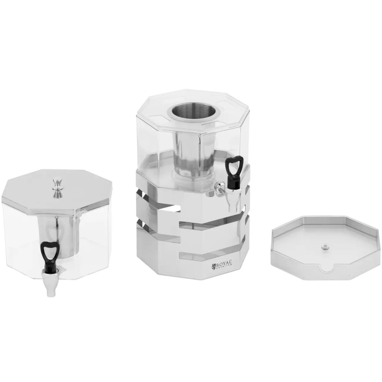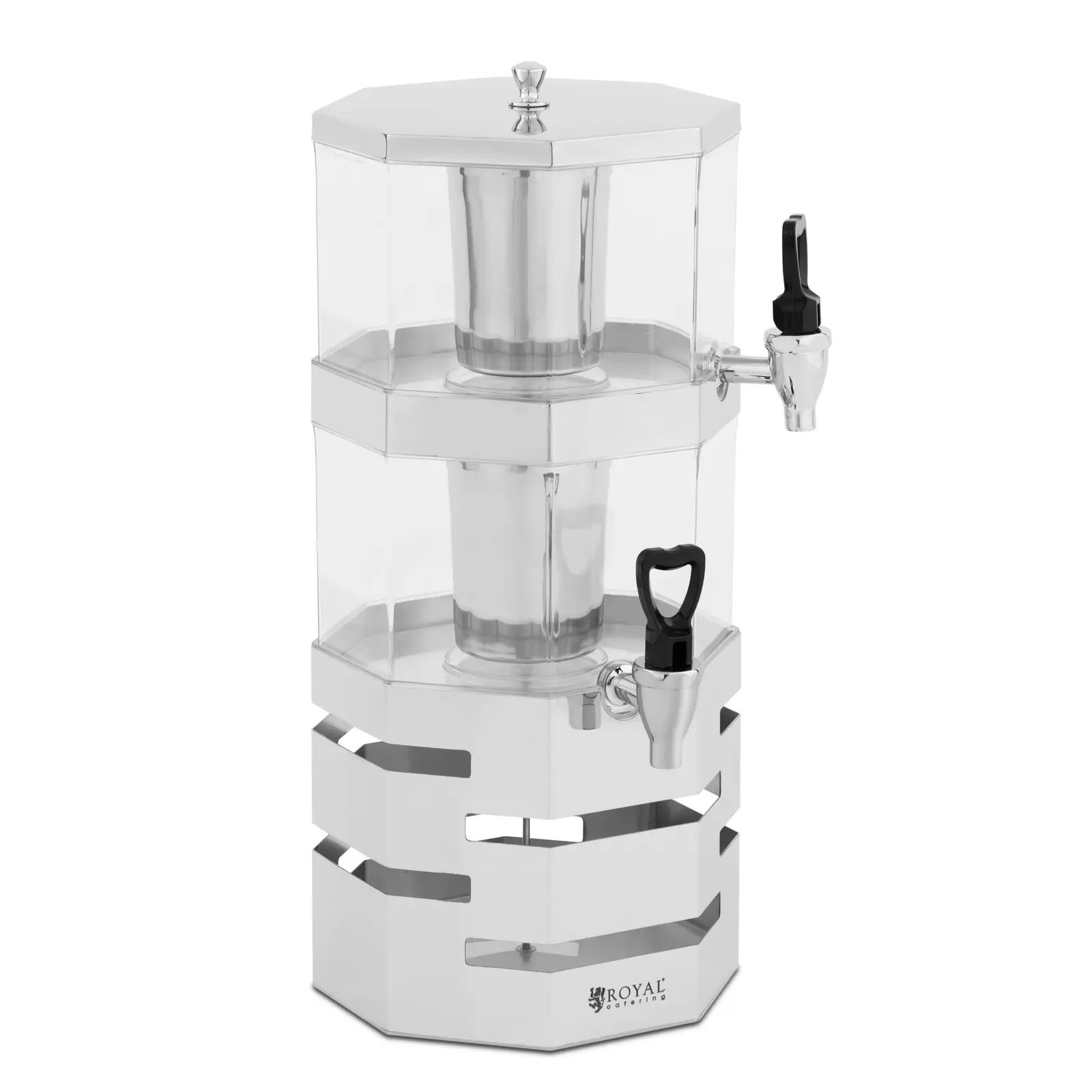Dyspenser do soków marki Royal Catering to doskonałe rozwiązanie dla hoteli, restauracji oraz na imprezy cateringowe. Jego elegancki design sprawia, że idealnie eksponuje soki, wodę, herbatę i inne napoje. Prosta obsługa podwójnego dozownika ułatwia serwowanie napojów gościom.