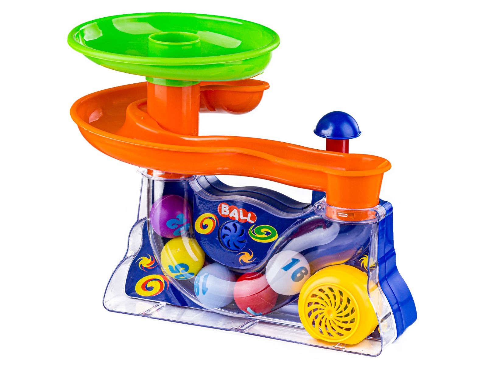 Po naciśnięciu wystającego grzybka uruchamia się dmuchawa, która wprowadza piłeczki w ruch. Pod wpływem nadmuchu piłeczki wystrzeliwują w górę, tworząc zachwycającą, kolorową piłeczkową fontannę. Bez obaw – piłeczki nie uciekną i nie rozsypią się po podłodze – każda z nich spada na zjeżdżalnię (ślimakowy tor) i znowu wpada do tunelu, by po chwili ponownie wyskoczyć w górę w kaskadzie podskakujących piłeczek.