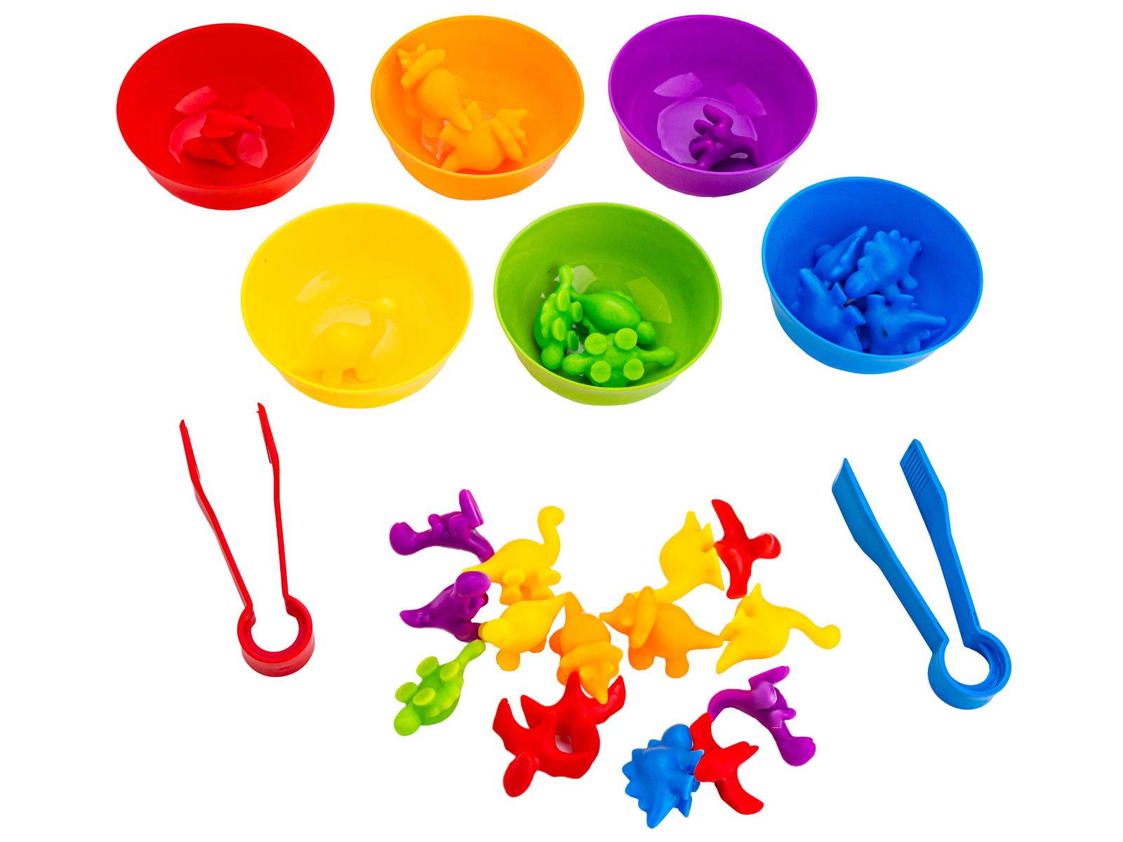 Zasady gry:Wszystkie dinozaury wysypujemy, mieszamy razem, rozkładamy też miseczki. Zadaniem dziecka jest za pomocą pęsetki posegregować dinozaury i umieścić odpowiedni kolor w odpowiedniej miseczce. | ![]() |