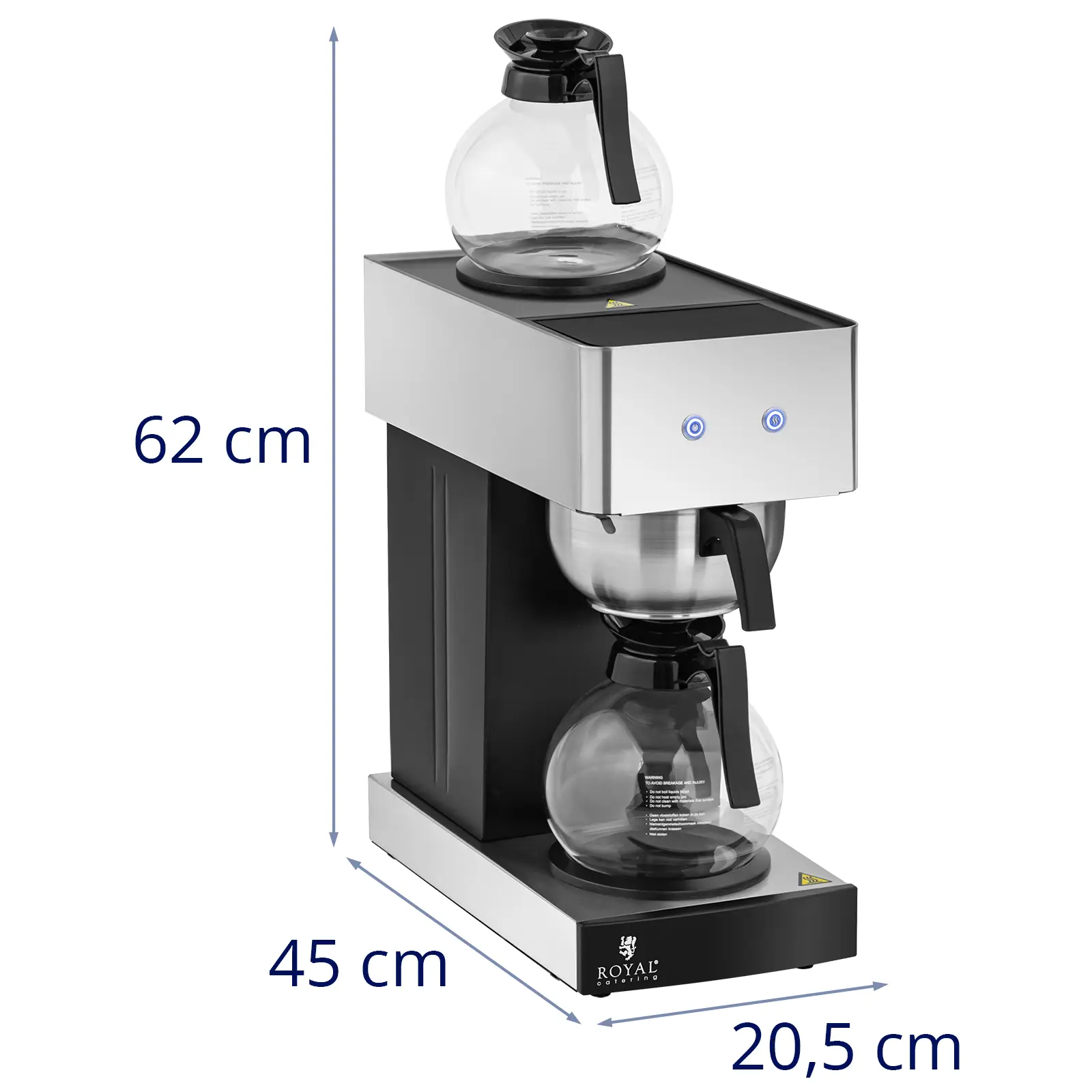 Ekspres charakteryzuje się wysoką wydajnością, umożliwiając przygotowanie do 100 filiżanek kawy na godzinę. Dwa szklane dzbanki o pojemności 1,8 litra każdy pozwalają na jednoczesne parzenie i serwowanie kawy. Płyty grzewcze działają niezależnie, co pozwala na oszczędność energii i utrzymanie napojów w idealnej temperaturze do 96°C przez długi czas.