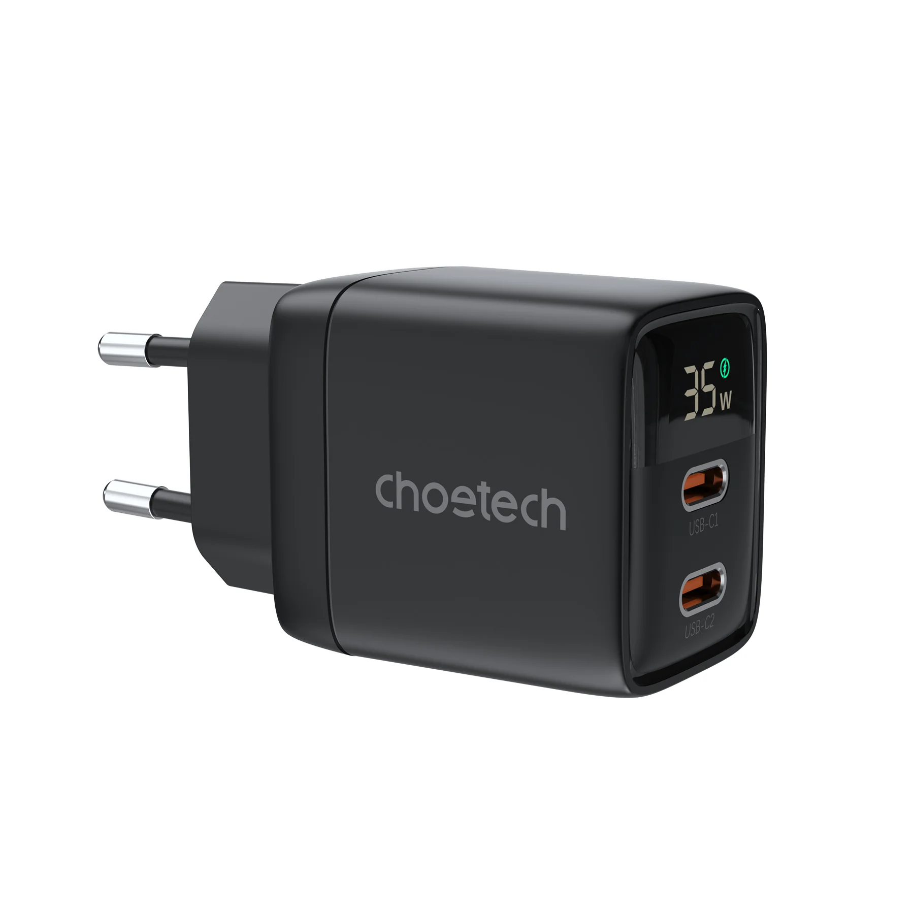 Mała mocna ładowarka sieciowa GaN 2x USB-C PD 35W z wyświetlaczem czarna