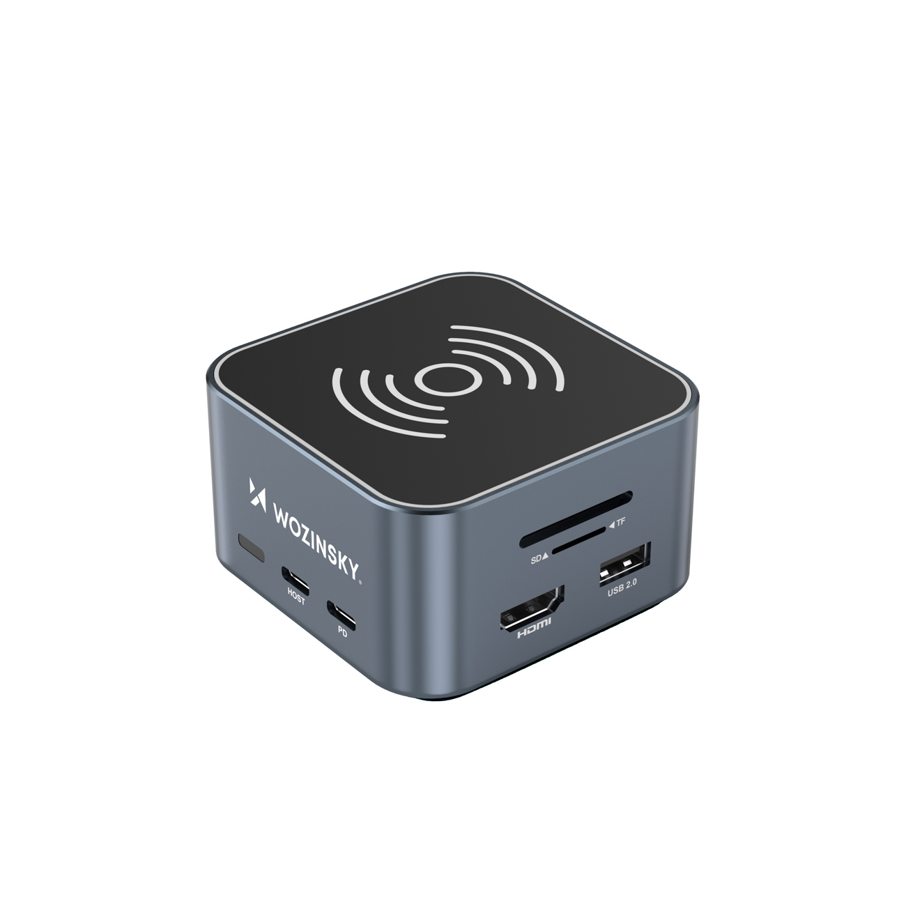 12w1 Hub z ładowarką bezprzewodową USB-A USB-C HDMI RJ45 SD TF mini jack - szary