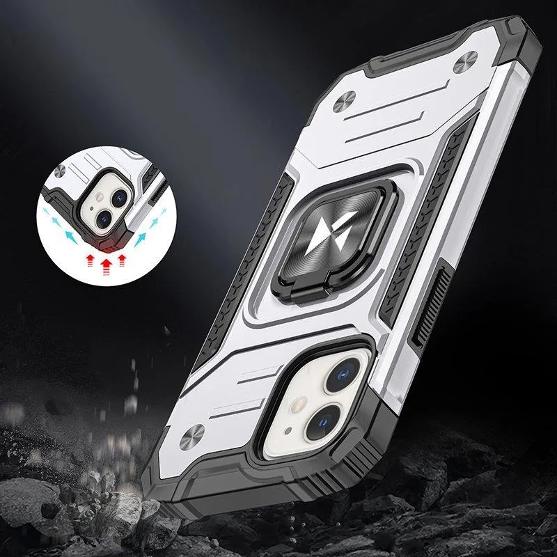 Pancerne etui iPhone 14 z serii Wozinsky Ring Armor, w kolorze srebrnym, z funkcją podstawki i uchwytem Ring.