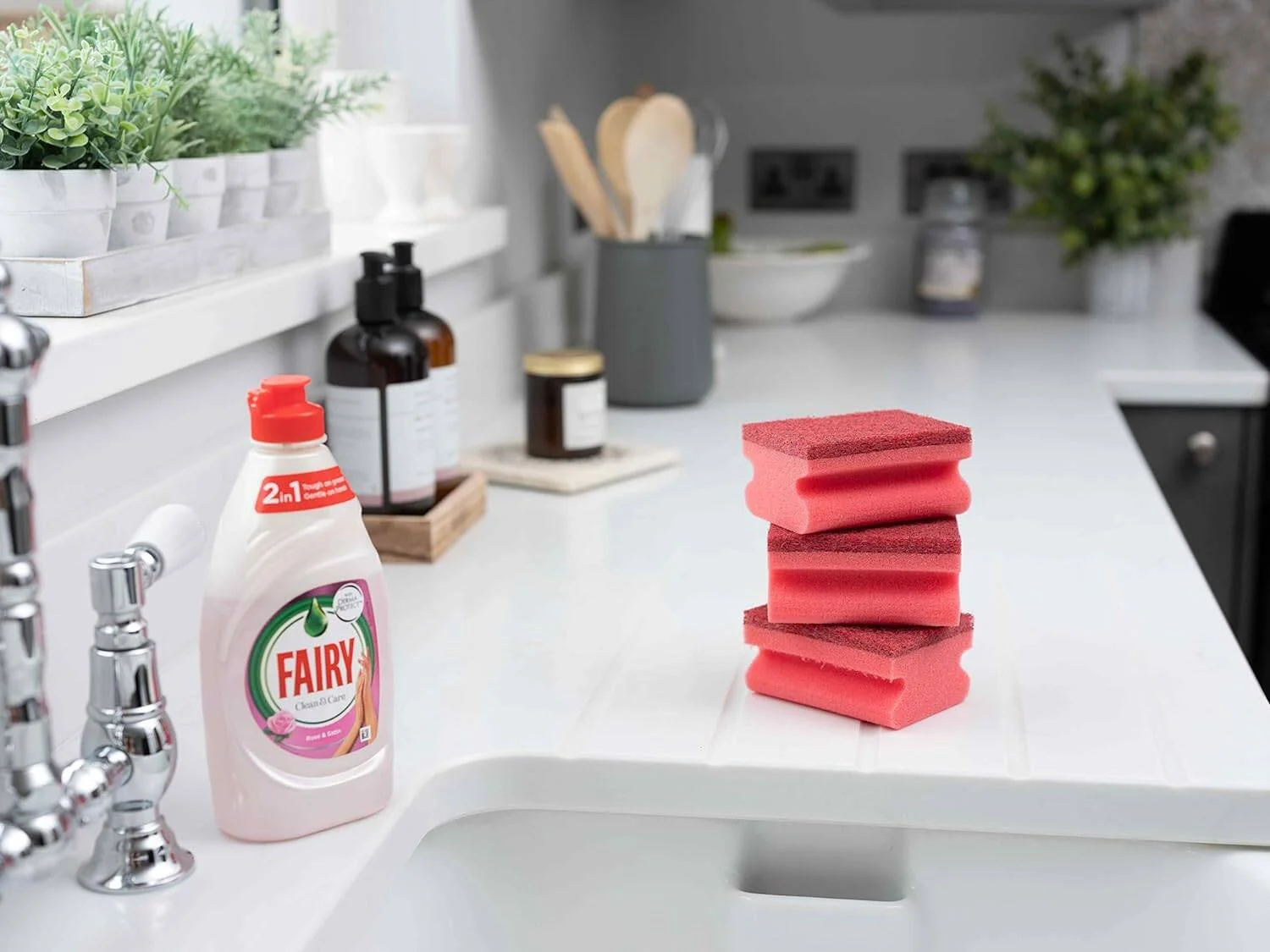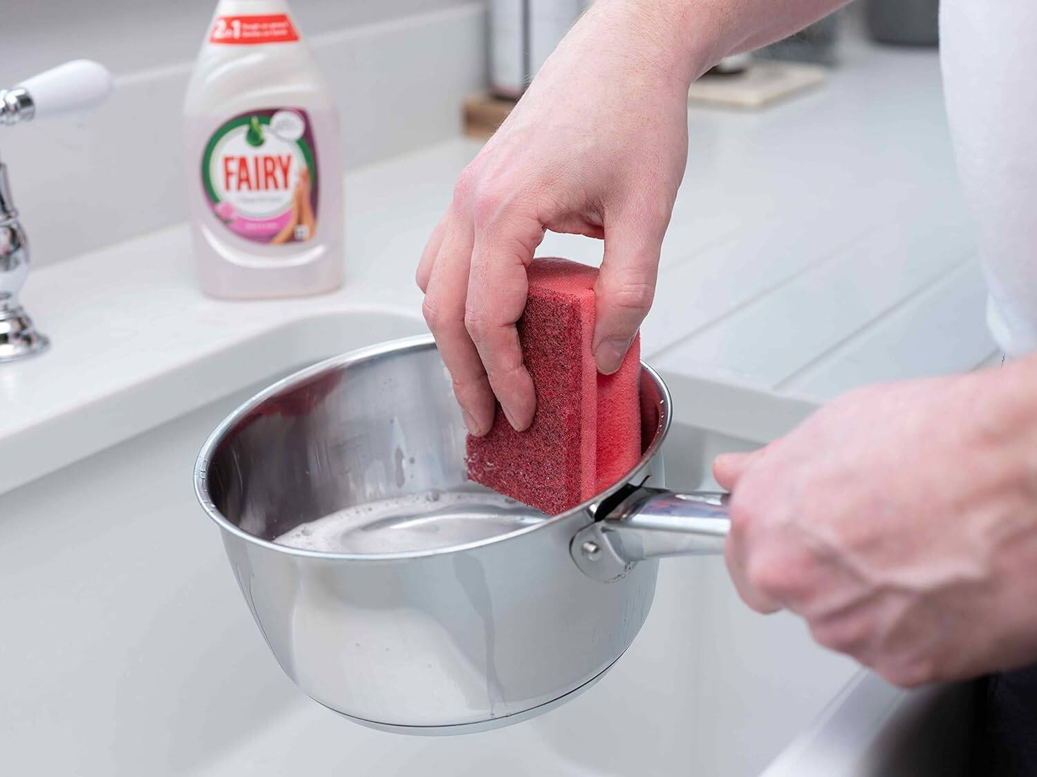 Zastosowanie płynu do mycia naczyń Fairy lub podobnego produktu wzmocni jego moc szorowania, umożliwiając łatwe usunięcie nawet najtrudniejszego brudu i tłuszczu. Każda gąbka ma wygodny wymiar oraz wyprofilowany kształt, który ułatwia chwyt i chroni dłonie.