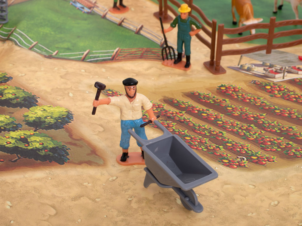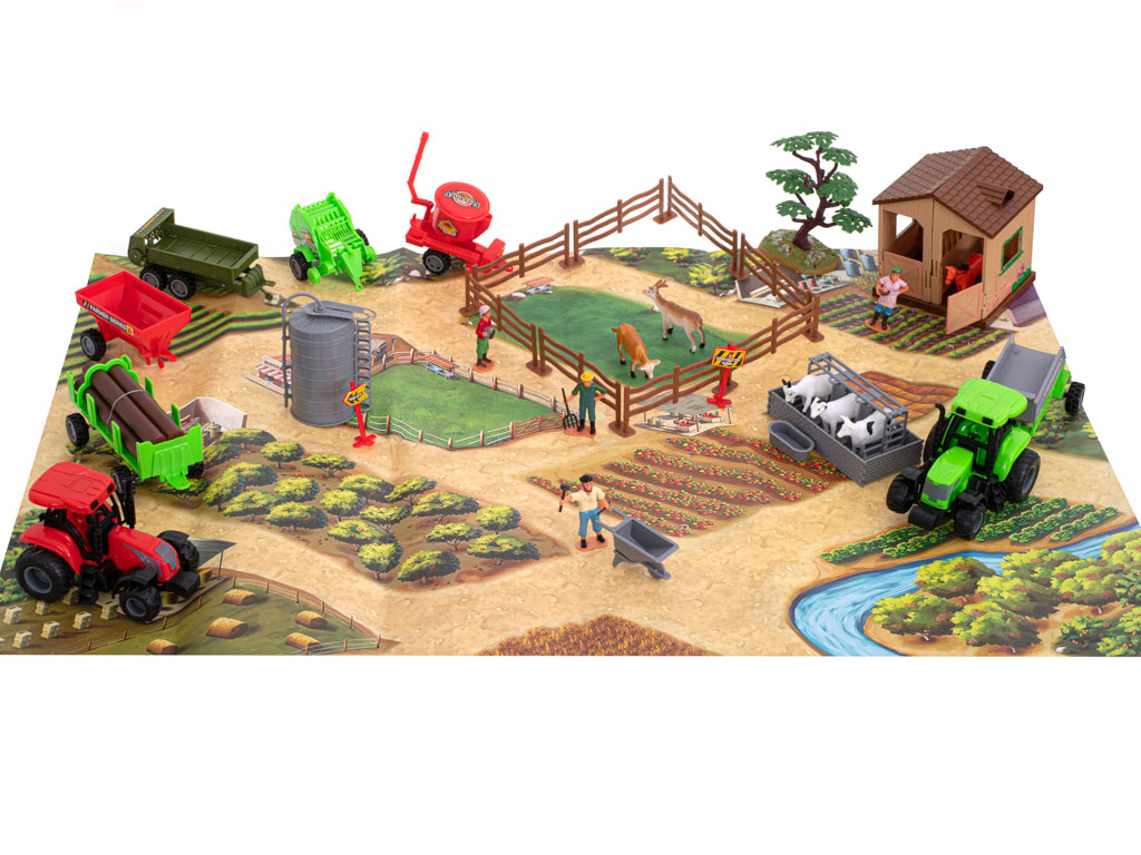 W skład zestawu wchodzi duża papierowa plansza, na której można zbudować stajnię dla koni oraz zagrodę dla zwierząt. Dzięki dwóm traktorom z wymiennymi przyczepami, dziecko z łatwością poradzi sobie z codziennymi obowiązkami na farmie.