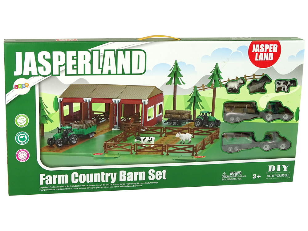Cała farma ma wszystkie elementy potrzebne do pracy. Na farmie znajdują się dwa traktory z przyczepami, jedną specjalną do wożenia drewna. W tyle znajduje się stodoła, w której nocują zwierzęta, dołączone do zestawu. Z tym zestawem konstrukcyjnym masz wszystkie elementy, by zbudować farmę z płotem, stodołą i siedzeniami.