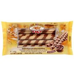 Spróbuj pysznych rurek waflowych z nadzieniem kakaowym. Te delikatne i kruche słodkości rozpływają się w ustach, oferując wyjątkowe połączenie smaków. Kremowe, czekoladowe nadzienie sprawia, że każdy kęs to prawdziwa przyjemność.