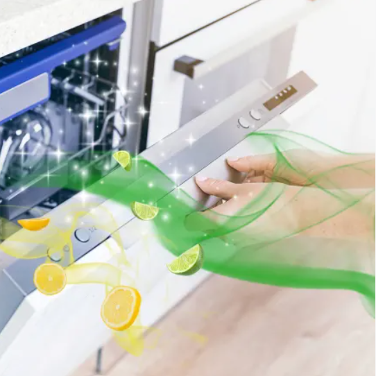 Odświeżacz emituje przyjemny aromat cytryny i limonki, który pozostaje na naczyniach po każdym otwarciu zmywarki. Dzięki temu możesz cieszyć się czystością i świeżością swoich talerzy oraz sztućców.
