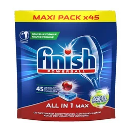 Każde opakowanie zawiera 45 sztuk tabletek, które działają również w niskich temperaturach. Pełnią funkcję soli i nabłyszczacza, co czyni je niezwykle wygodnymi w użyciu. Dzięki technologii Powerball usuwają nawet przypalone resztki jedzenia, zapewniając naczyniom olśniewający wygląd bez smug.