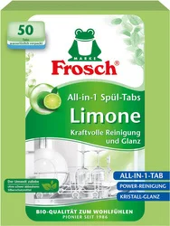 Tabletki do zmywarki Frosch Limone All-in-1 to innowacyjne rozwiązanie w codziennym myciu naczyń. Dzięki swojej unikalnej formule z limonką, skutecznie usuwają zanieczyszczenia, odtłuszczają oraz nabłyszczają naczynia. Oferują także funkcję soli, a ich działanie chroni szkło i nadaje połysk stali nierdzewnej.