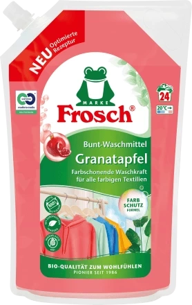 Frosch Granatapfel to zaawansowany detergent przeznaczony do prania kolorowych tekstyliów w temperaturach od 20 do 60°C. Jego innowacyjna formuła z ekstraktem z granatu skutecznie chroni intensywność kolorów, zapewniając długotrwałe, żywe barwy. Produkt ten nie zawiera konserwantów i został przebadany dermatologicznie, co gwarantuje bezpieczeństwo dla skóry.