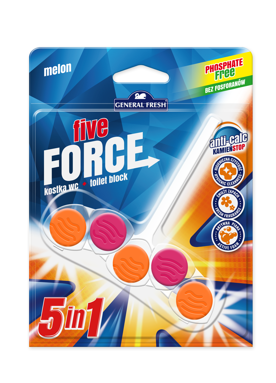 Odkryj nowoczesną zawieszkę WC General Fresh Five Force Melon. Dzięki dwukolorowej masie i świeżym zapachom, sprzątanie staje się przyjemnością.