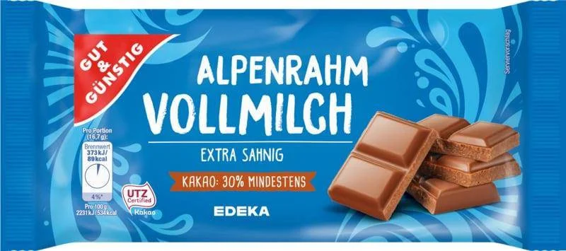 Składniki: cukier, masło kakaowe, miazga kakaowa, 11% pełne mleko w proszku, 6,0% śmietanka w proszku, słodka serwatka w proszku, czyste tłuszcze masłowe, emulgator: lecytyny (zawiera soję); naturalny aromat waniliowy. Może zawierać śladowe ilości glutenu i orzechów.