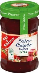 Skład konfitury to mieszanka owocowa, w której znajdziesz 50% truskawek i rabarbaru, cukier, syrop glukozowo-fruktozowy, kwas cytrynowy, pektyny jako środek żelujący oraz sok z czerwonych winogron jako barwnik.