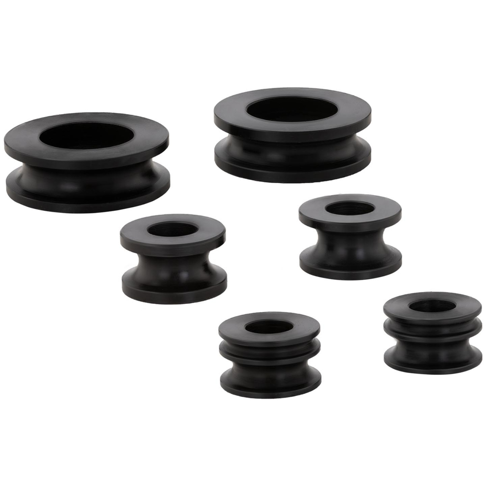 W zestawie znajdują się matryce o różnych wymiarach: 9 mm, 11 mm, 12 mm, 15 mm, 20 mm oraz 22 mm. Umożliwiają one dostosowanie giętarki do różnych średnic rur, takich jak 3/8'', 1/2'', 9/16'', 5/8'', 3/4'' oraz 7/8''. Obsługa giętarki jest łatwa dzięki zastosowaniu dźwigni.