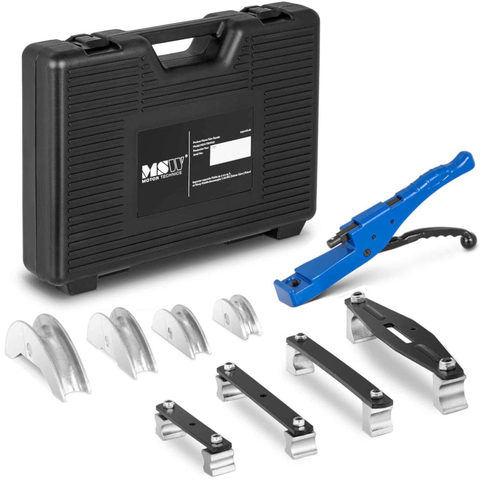 W zestawie znajdują się cztery wymienne głowice, co pozwala na dostosowanie giętarki do różnych materiałów. Dzięki solidnemu wykonaniu z aluminium, narzędzie jest trwałe i odporne na uszkodzenia. Mobilna walizka z tworzywa sztucznego ułatwia transport i przechowywanie.