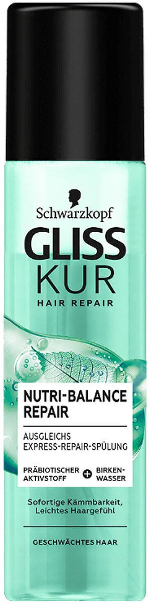 Gliss Kur Nutri-Balance Repair to ekspresowa odżywka, która skutecznie wzmacnia osłabione włosy. Dzięki prebiotykowi i wodzie brzozowej, wspiera równowagę mikrobiomów skóry głowy oraz włosów. Produkt wygładza włosy, ułatwiając ich rozczesywanie, co sprawia, że codzienna pielęgnacja staje się prostsza.