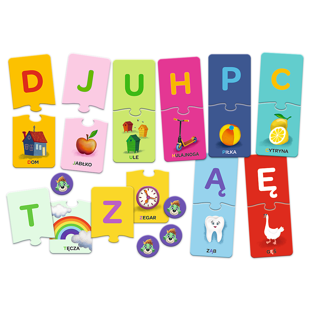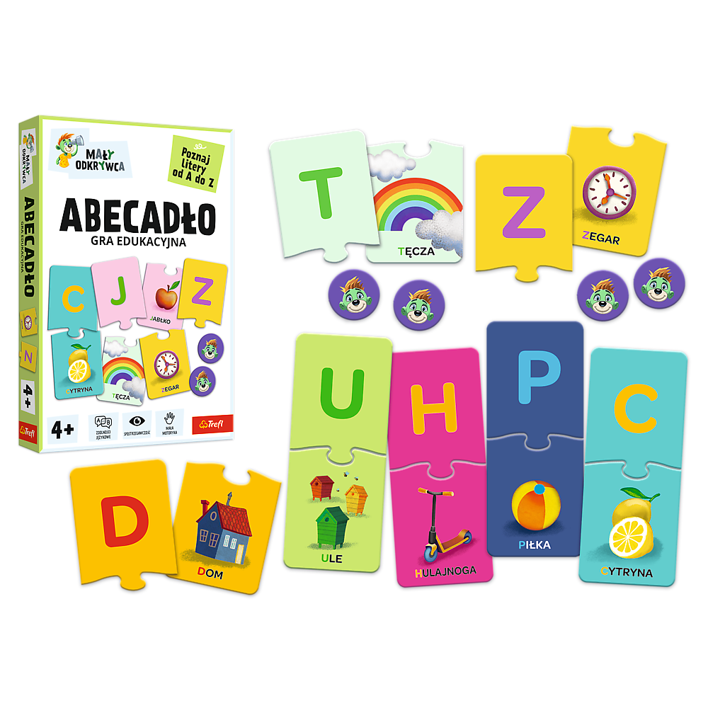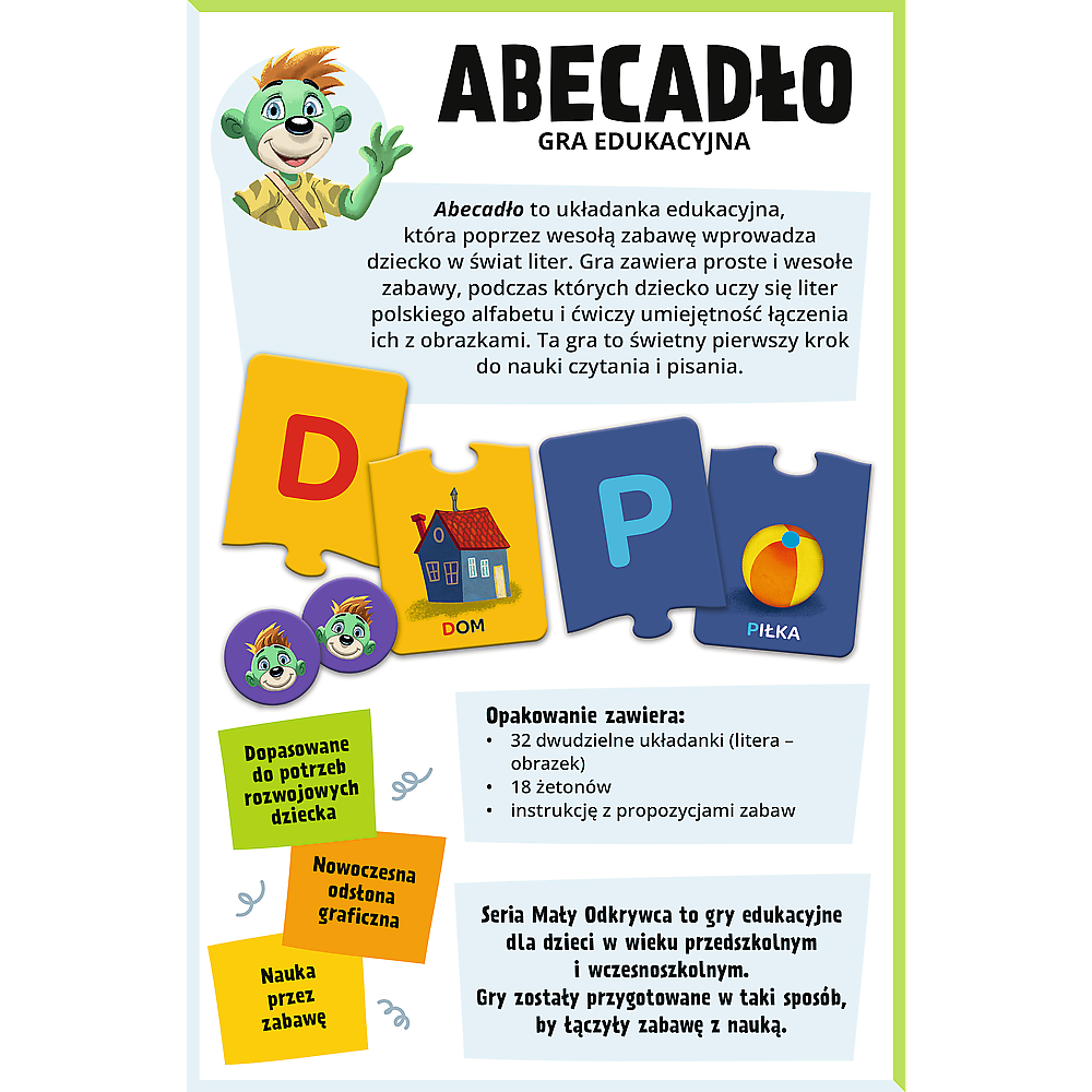 Abecadło to edukacyjna układanka dla przedszkolaków, która w przyjazny sposób wprowadza dzieci w świat liter. Poprzez zabawę maluchy uczą się rozpoznawać litery polskiego alfabetu oraz łączenia ich z obrazkami. To doskonały sposób na połączenie nauki z radością odkrywania alfabetu! Świetny pierwszy krok do nauki czytania i pisania.