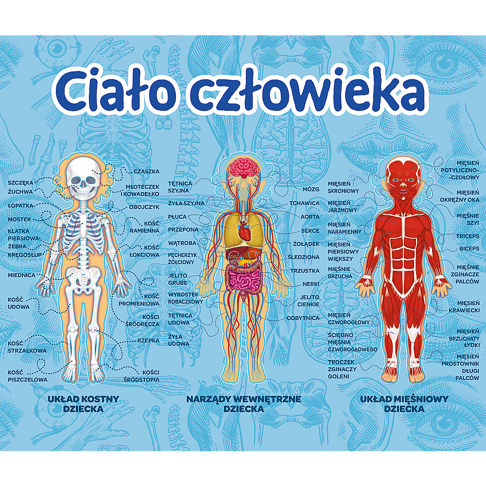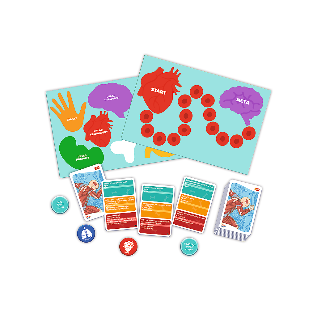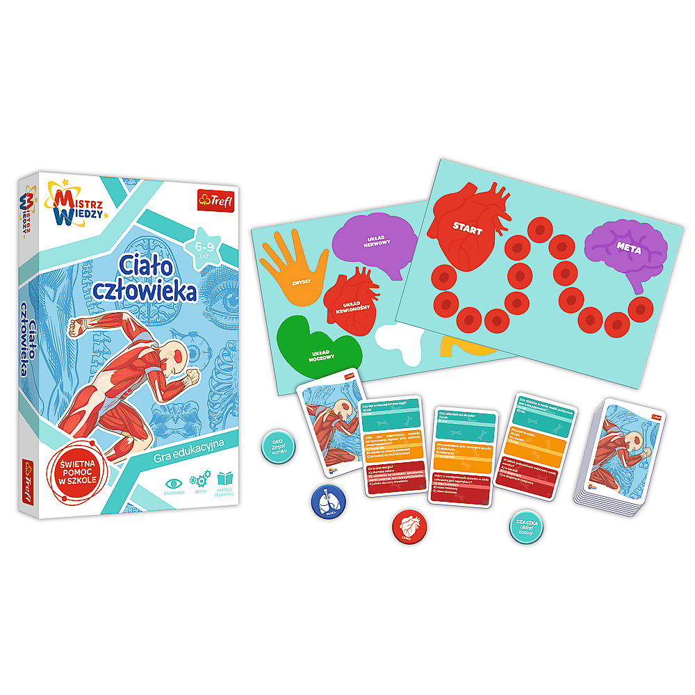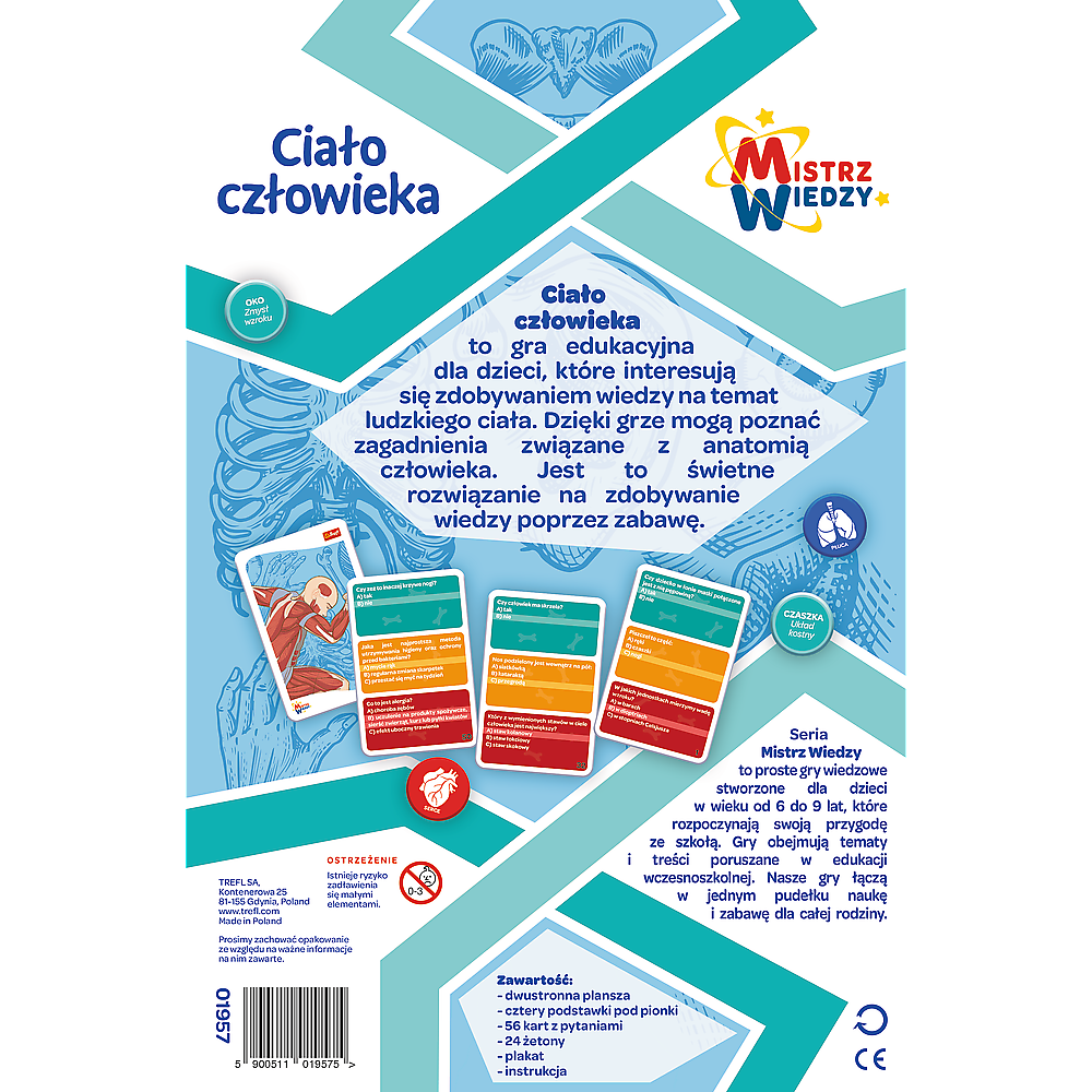 Mistrz Wiedzy Ciało Człowieka to gra edukacyjna dla dzieci w wieku 6-9 lat.Podczas dobrej zabawy dzieci zdobywają wiedzę na temat ludzkiego ciała. Czy wiesz, jak zbudowane jest ludzkie ciało? Czy potrafisz poprawnie nazwać wszystkie części ciała? Dołącz do gry i sprawdź swoją wiedzę z zakresu anatomii! Pięknie ilustrowana plansza, barwne pionki i żetony to doskonałe zaproszenie do świata nauki, poprzez świetną zabawę! Gra daje wiele opcji na doskonałą zabawę, a jej forma zależy tylko od Ciebie! Masz dziś ochotę na quiz, grę planszową czy memos? Plakat odkrywający tajemnice ludzkiego ciała możesz zawiesić na ścianie Twojego pokoju i wracać do niego w wolnych chwilach. Poznaj anatomię człowieka i zostań Mistrzem Wiedzy! Ciało Człowieka to edukacyjna gra dla dzieci, która łączy quiz, grę planszową, układankę i memos oraz uczy tego, jak wygląda ludzkie ciało. Ponadto zestaw będzie doskonałą pomocą naukową w edukacji wczesnoszkolnejCechy Gry:• Gra Edukacyjna, Rodzinna • Nauka przez zabawę• Proste zasady• Połączenie gry planszowej, quizu, układanki i gier typu memory• Idealna dla dzieci w wieku 6-9 lat.• Pomoc naukowa w edukacji wczesnoszkolnejGra rozwija: • Wiedzę dotyczącą podstaw anatomii• Pamięć i koncentrację• Pobudza ciekowość świata i zachęca do naukiPoznaj Gry Trefl i podziel się radością z rozgrywki.Gry planszowe to doskonały prezent z okazji urodzin, Dnia Dziecka lub pod choinkę. Świetnie sprawdzą się podczas spotkania towarzyskiego oraz chwil spędzanych w gronie rodzinnym. Zawartość pudełka:• 4 pionki• dwustronna plansza • 56 kart z pytaniami• 24 żetony ze znakami drogowymi• plakat edukacyjny.• InstrukcjaWymiary pudełka: 287x192x39Ilość Graczy: 2 -4Średni czas rozgrywki: 20 -30 minWiek: 6 -9